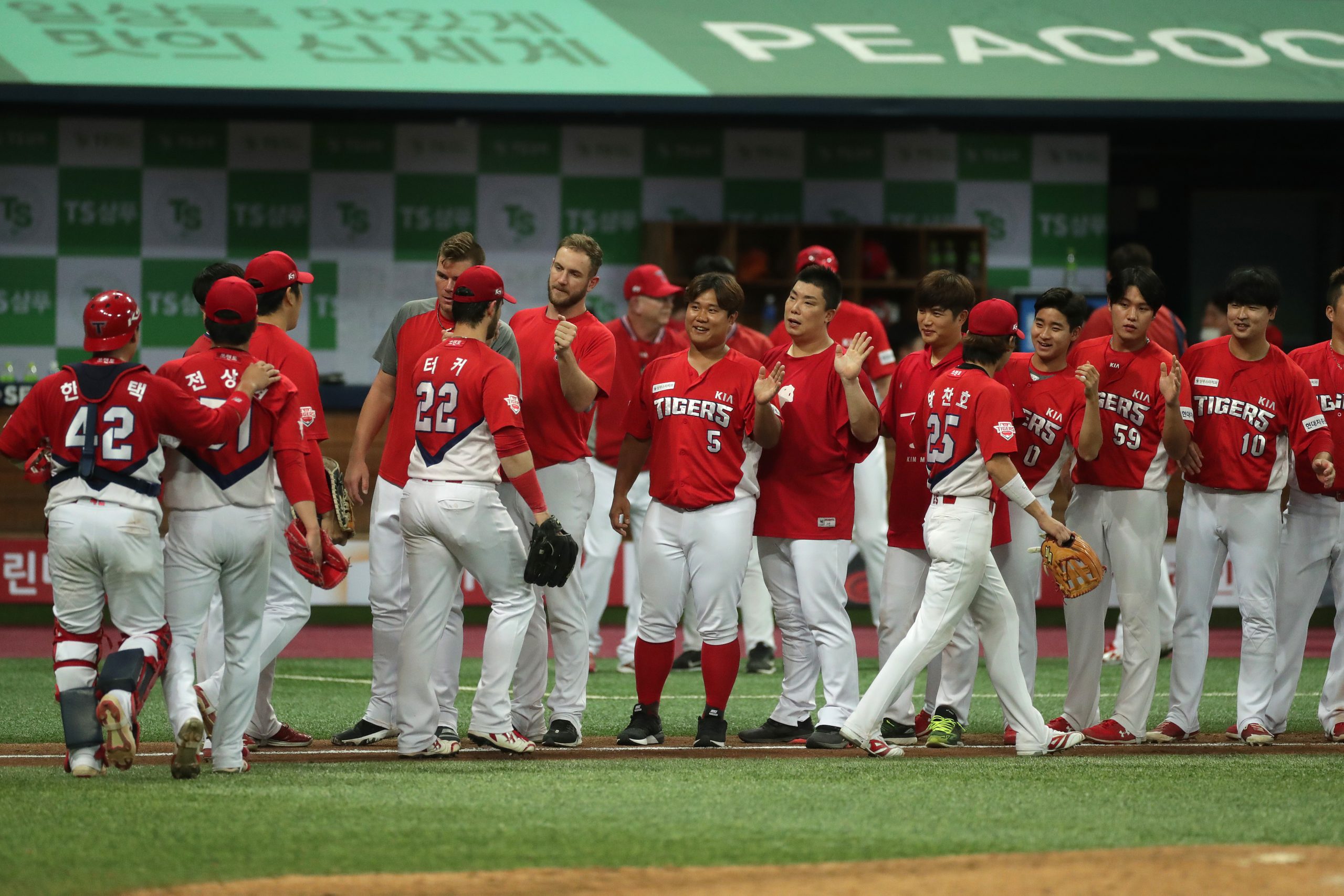 Photo Credit: KIA Tigers players celebrate after winning the KBO League game. (Photo by Han Myung-Gu/Getty Images)
