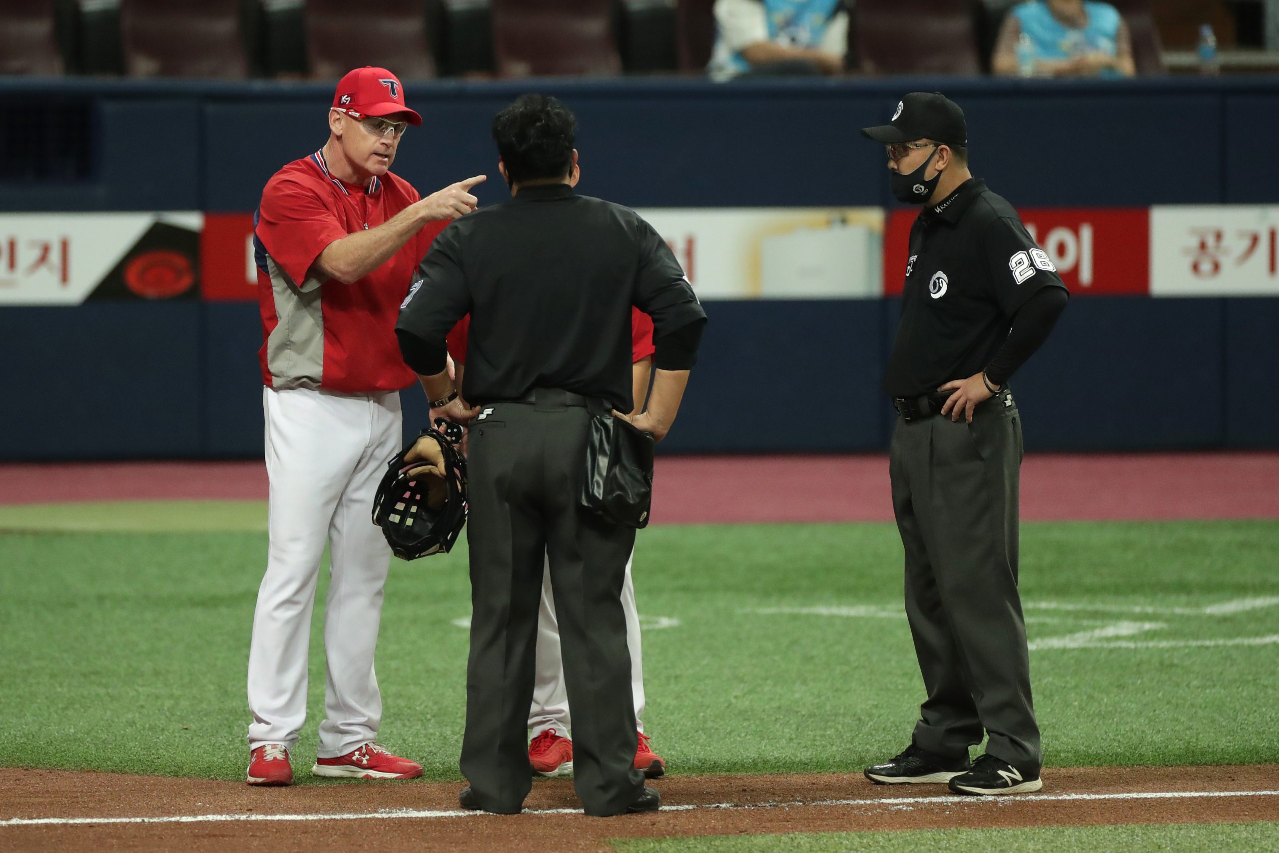 Head coach, Matt Williams of KIA Tigers talks with umpires. (Photo by Han Myung-Gu/Getty Images)