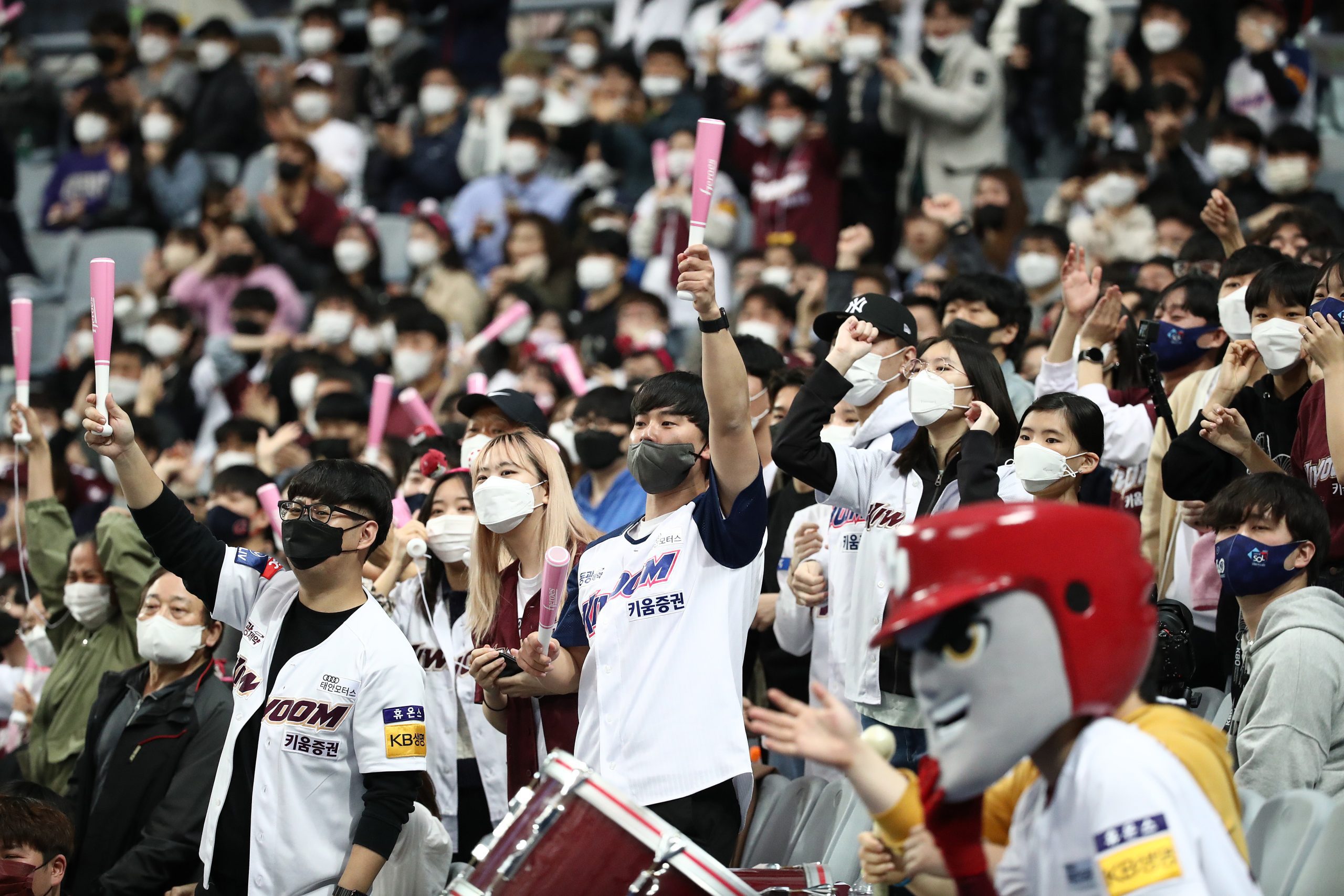 Photo Credit: Kiwoom Heroes fans cheer during the Korean Baseball Organization (KBO) League opening game between Kiwoom Heroes and Lotte Giants at Gocheok Skydome on April 02, 2022 in Seoul, South Korea. (Photo by Chung Sung-Jun/Getty Images)