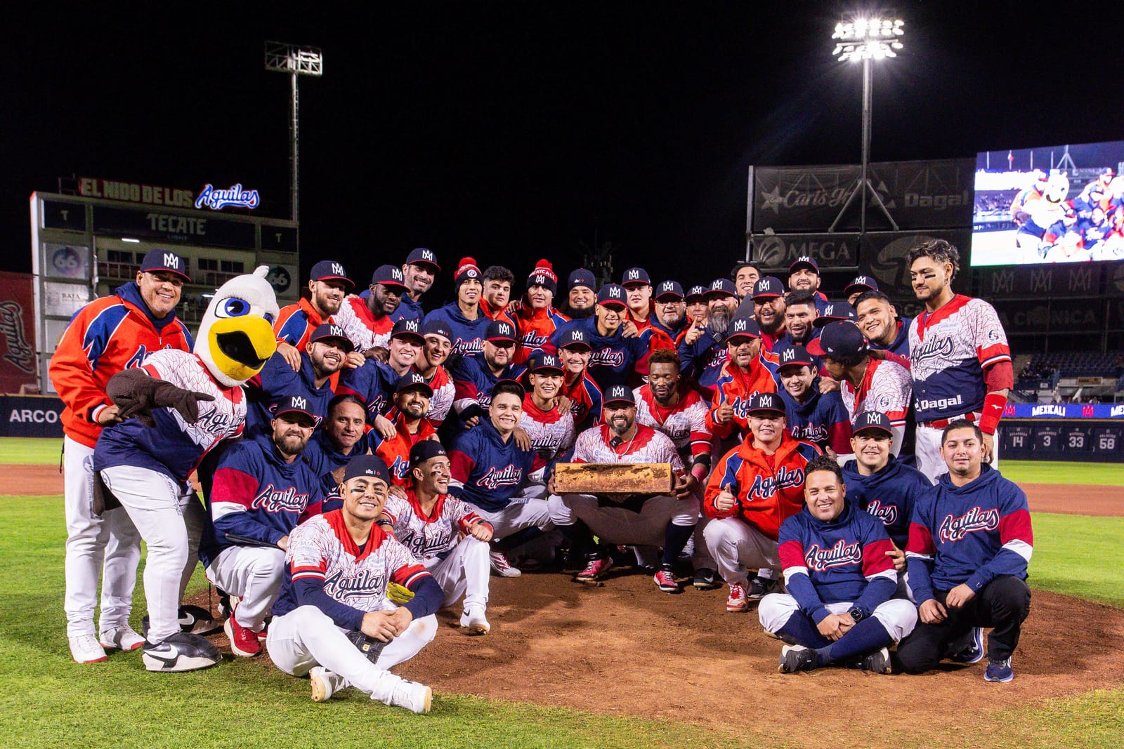 Photo: Jake Sanchez and the Aguilas de Mexicali pose with the pitcher’s rubber after Sanchez set the career record for saves in the Liga ARCO Mexicana del Pacifico. (Photo courtesy of the LAMP)