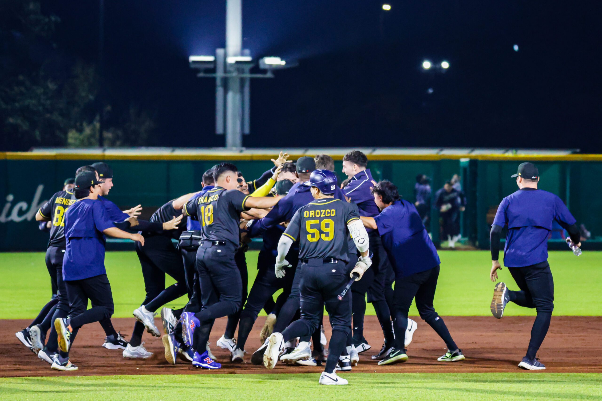 Photo: The Jaguares de Nayarit celebrate their dramatic win in the final game of the 2025-26 season’s first half, mobbing Brandon Villareal after his double drove in the winning run in the bottom of the ninth. (Photo courtesy of LAMP)