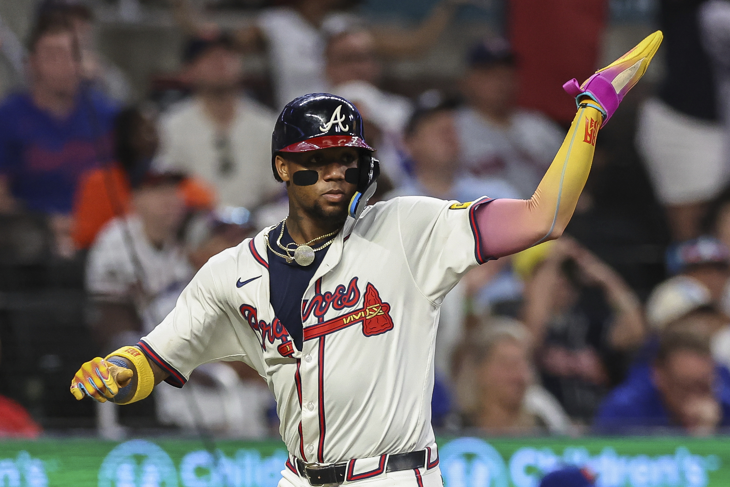 Photo: Atlanta Braves’ Ronald Acuña Jr. waves home baserunners while scoring a run in the sixth inning of a baseball game against the New York Mets, Thursday, June 19, 2025, in Atlanta. (AP Photo/Colin Hubbard)