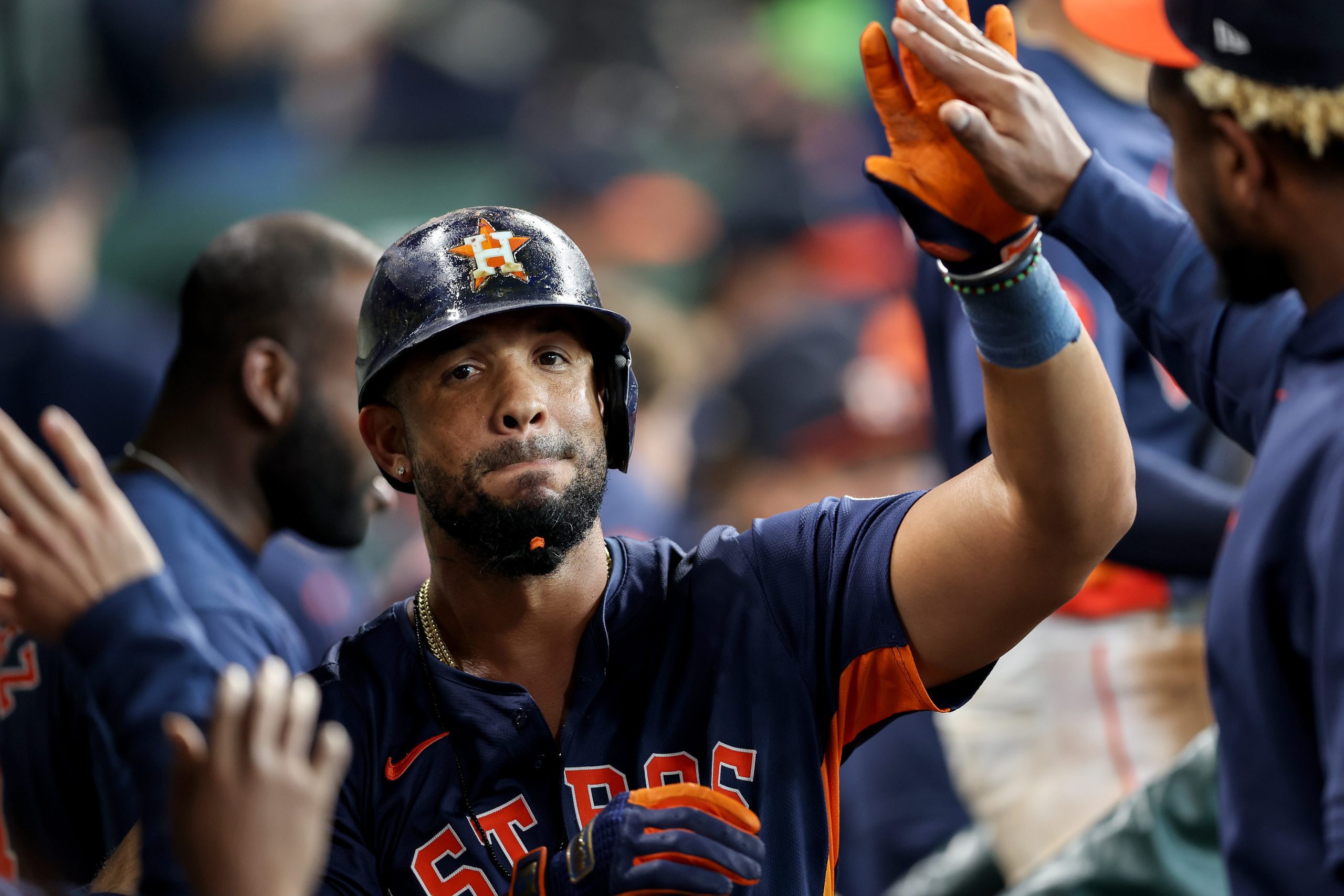 Photo Credit: Jose Abreu #79 of the Houston Astros is congratulated by teammates in the dugout after a solo home run in the second inning against the Minnesota Twins at Minute Maid Park on June 01, 2024 in Houston, Texas. (Photo by Tim Warner/Getty Images)