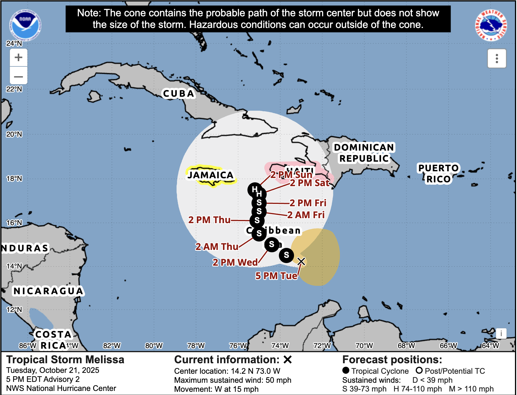 Graphic: The cone of probability for Tropical Storm Melissa as of 5 p.m. on Tuesday, Oct. 21. (Courtesy of NOAA/National Hurricane Center)