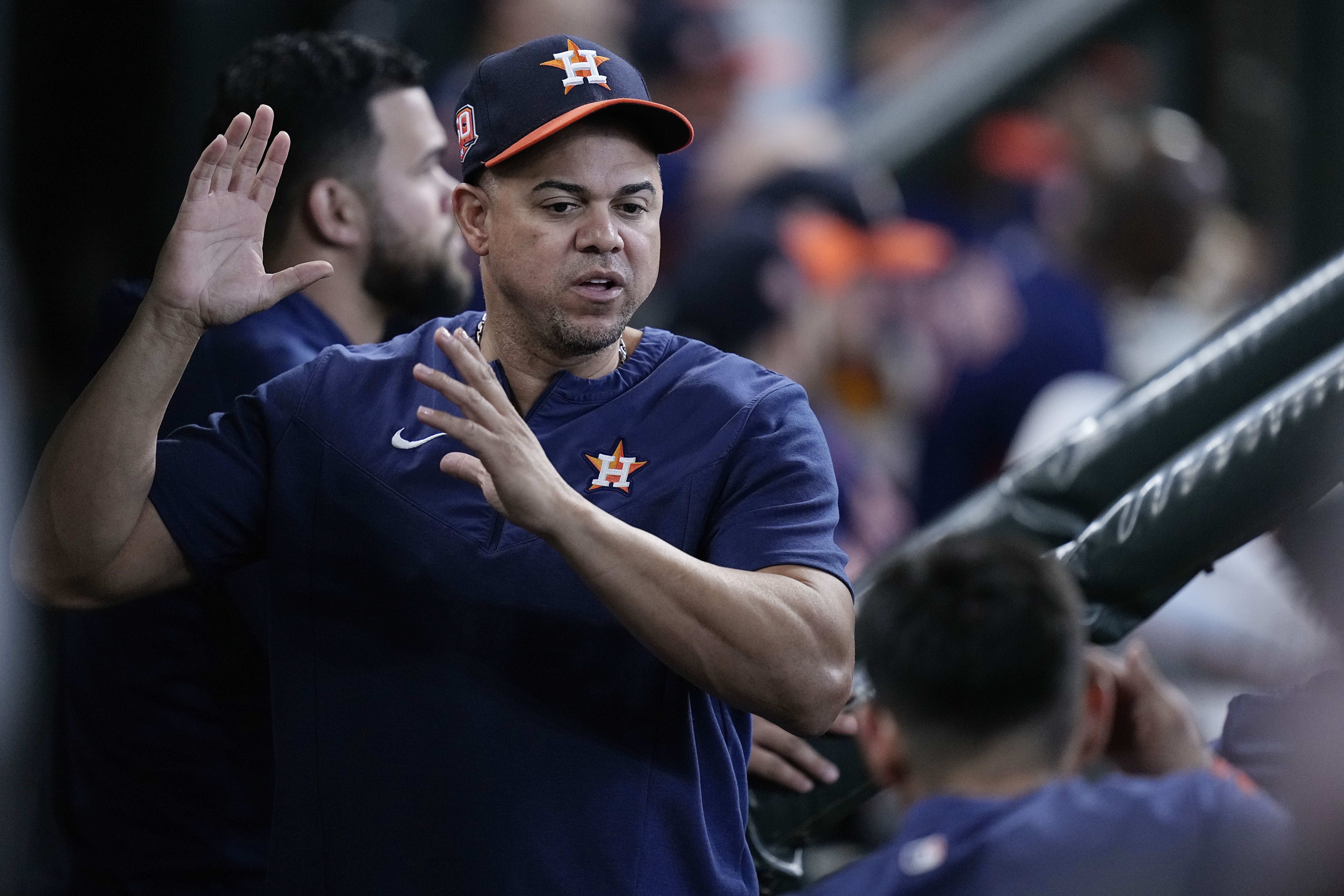 Photo: Houston Astros hitting coach Alex Cintron talks with players in the dugout during a baseball game against the Tampa Bay Rays Sunday, Oct. 2, 2022, in Houston. (AP Photo/Kevin M. Cox)