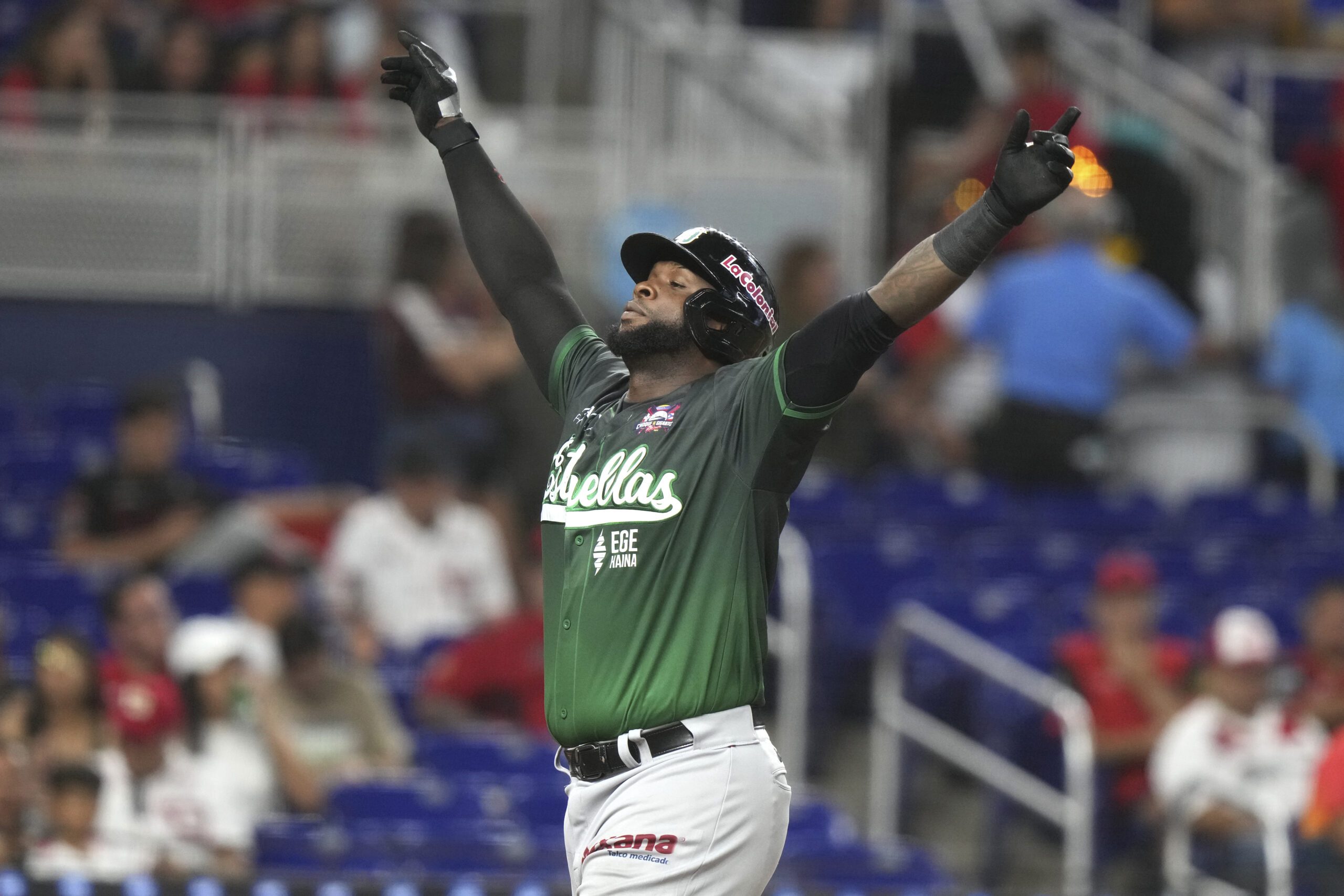 Photo: Estrellas Orientales’ Miguel Sano reacts after hitting a two-run home run in the seventh inning against the Cardenales de Lara during the Choque De Gigantes baseball tournament, Friday, Nov. 8, 2024, in Miami. (AP Photo/Lynne Sladky)
