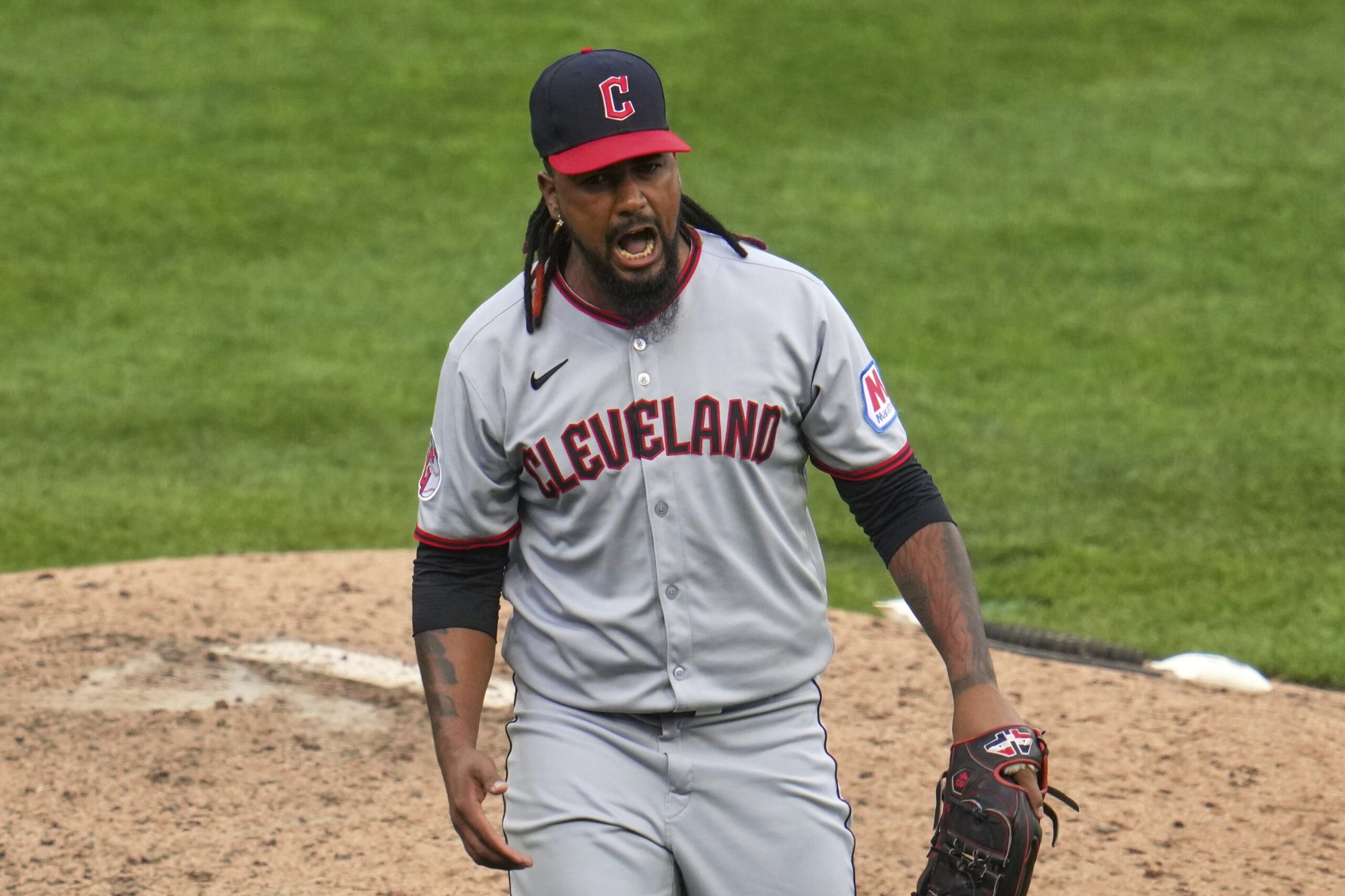 Photo: Emmanuel Clase reacts after getting the final out of a baseball game against the Pittsburgh Pirates in Pittsburgh, Saturday, April 19, 2025. (AP Photo/Gene J. Puskar)