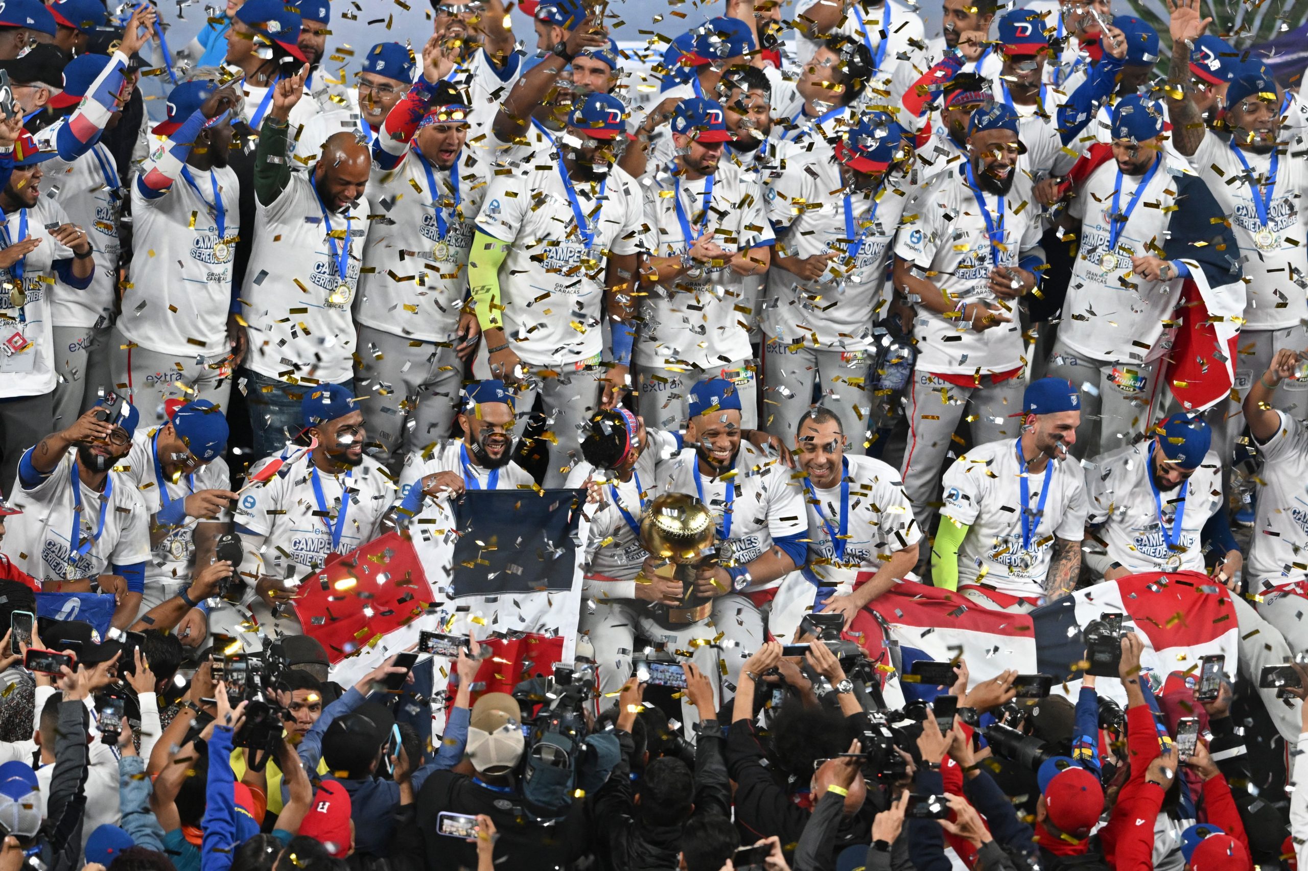 Dominican Republic’s Tigres de Licey celebrate with the trophy. (Photo by Yuri CORTEZ / AFP) (Photo by YURI CORTEZ/AFP via Getty Images)