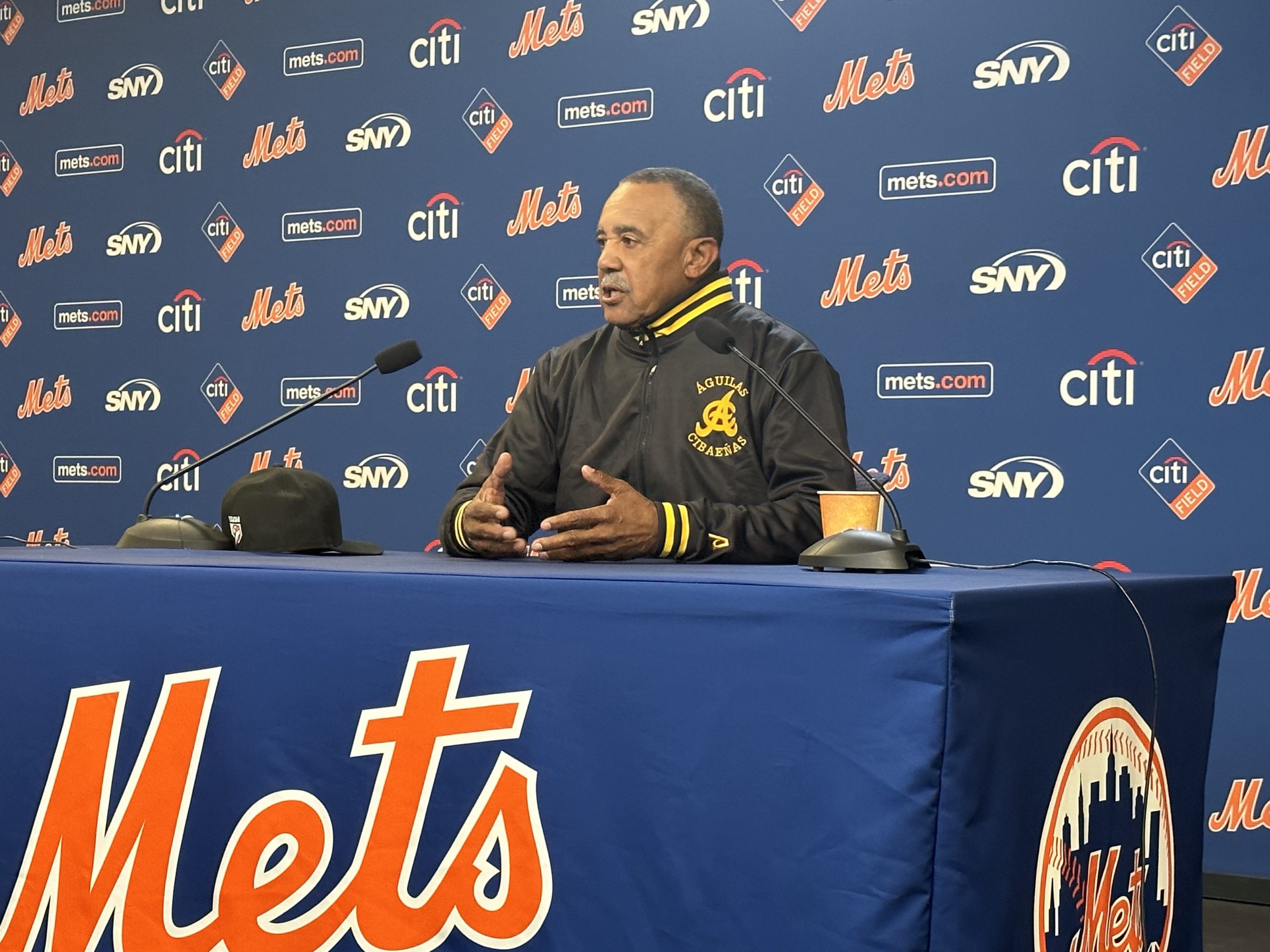 Aguilas Cibaenas manager Tony Pena addresses the media at Citi Field in New York before game one of the Titanes del Caribe series between his club and the Tigres del Licey. (Photo: Leif Skodnick/World Baseball Network)
