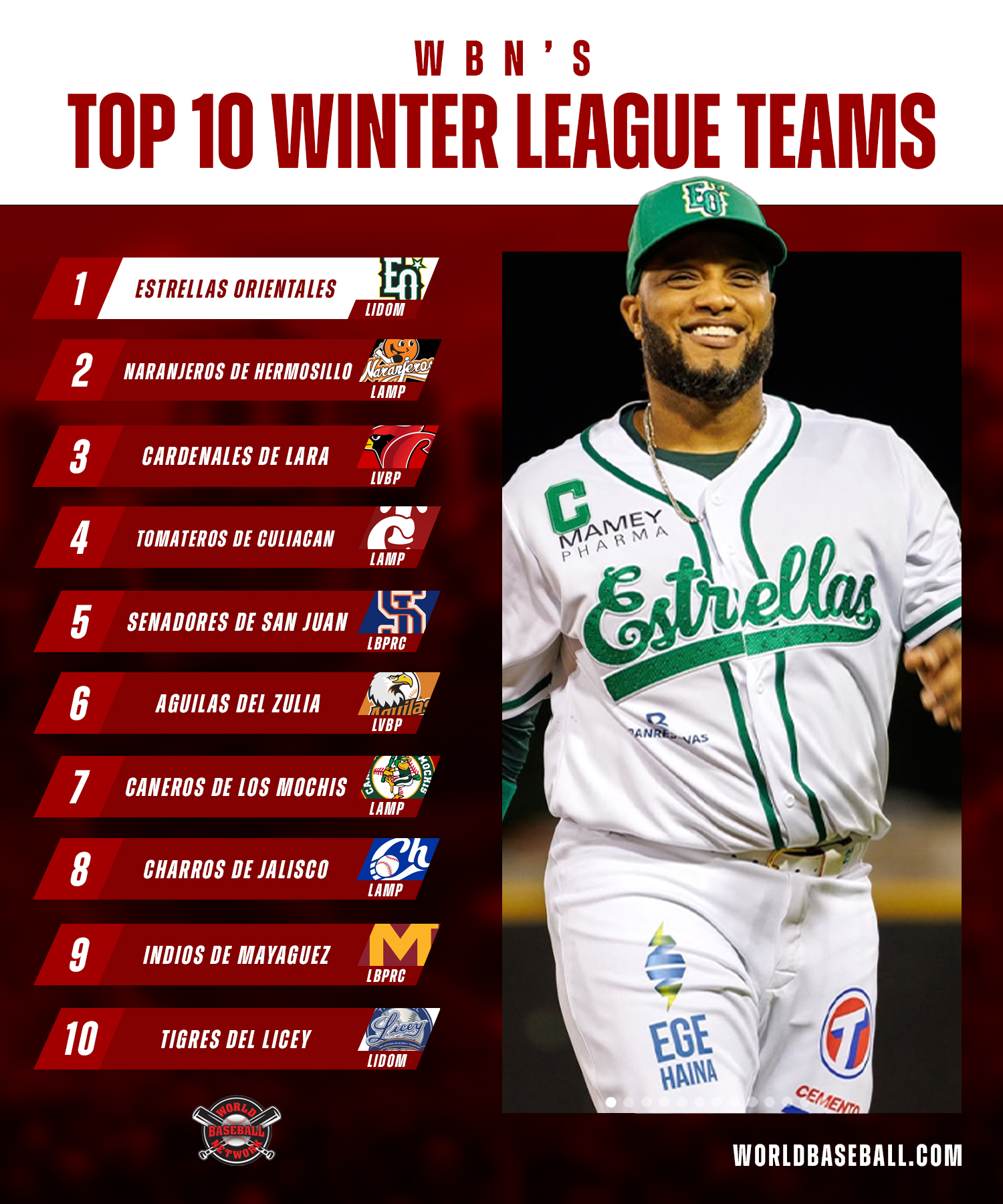 The Estrellas Orientales have risen to the top of the World Baseball Network‘s weekly Winter Ball Poll, garnering two of four first place votes and 37 total points in this week’s balloting.