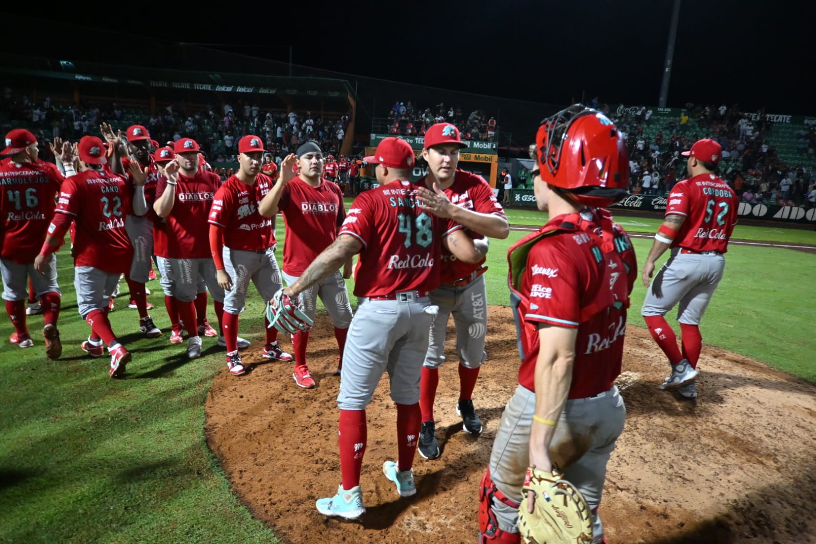 Trevor Bauer and the Diablos Rojos del Mexico celebrate their 5-2 win against the Leones de Yucatan in game three of the Serie del Zona in Merida, Yucatan. (Photo courtesy of the Diablos Rojos del Mexico.)