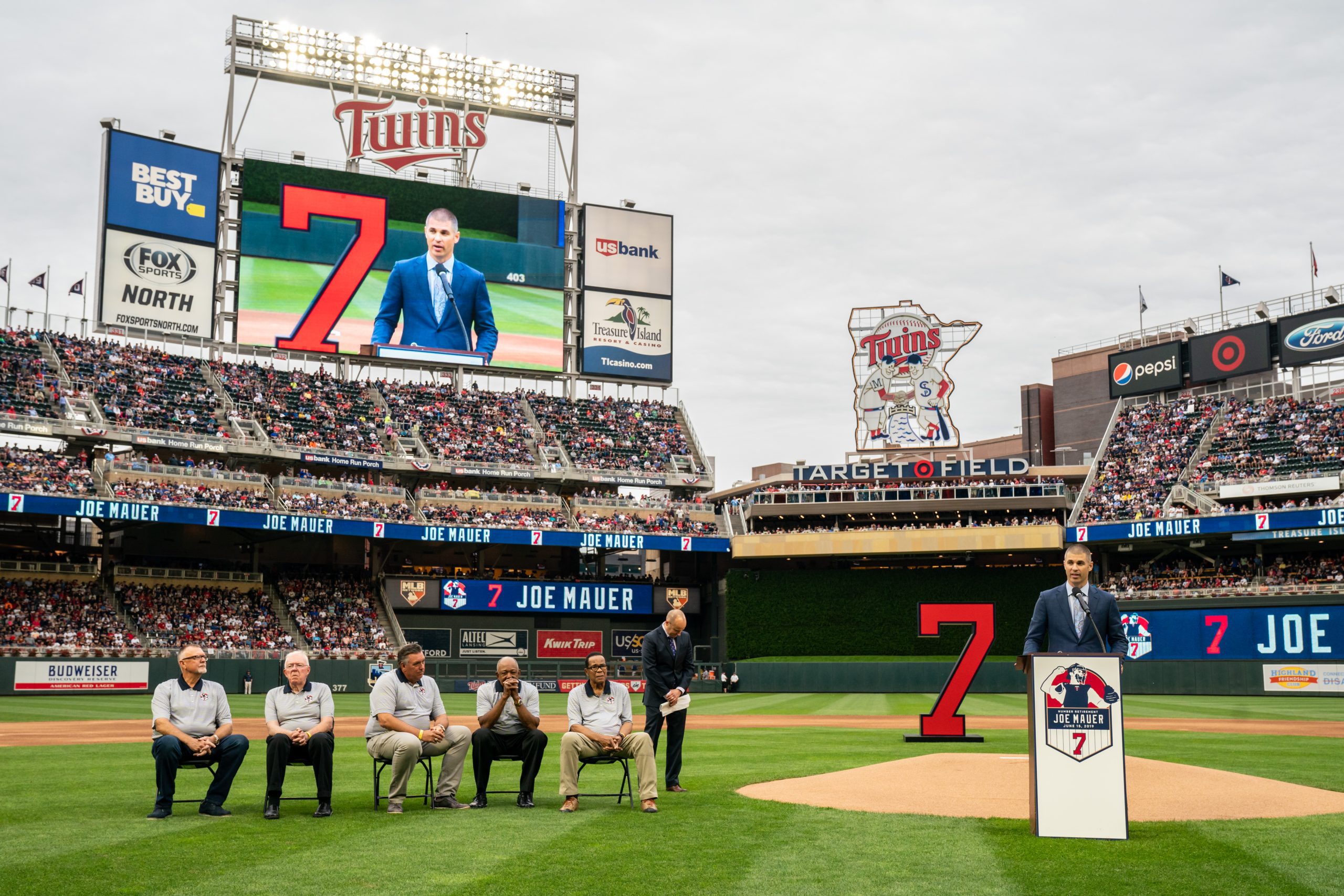 Photo Credit: Former player Joe Mauer is honored as the Minnesota Twins retire his number at Target Field in Minneapolis, Minnesota. (Photo by Brace Hemmelgarn/Minnesota Twins/Getty Images)