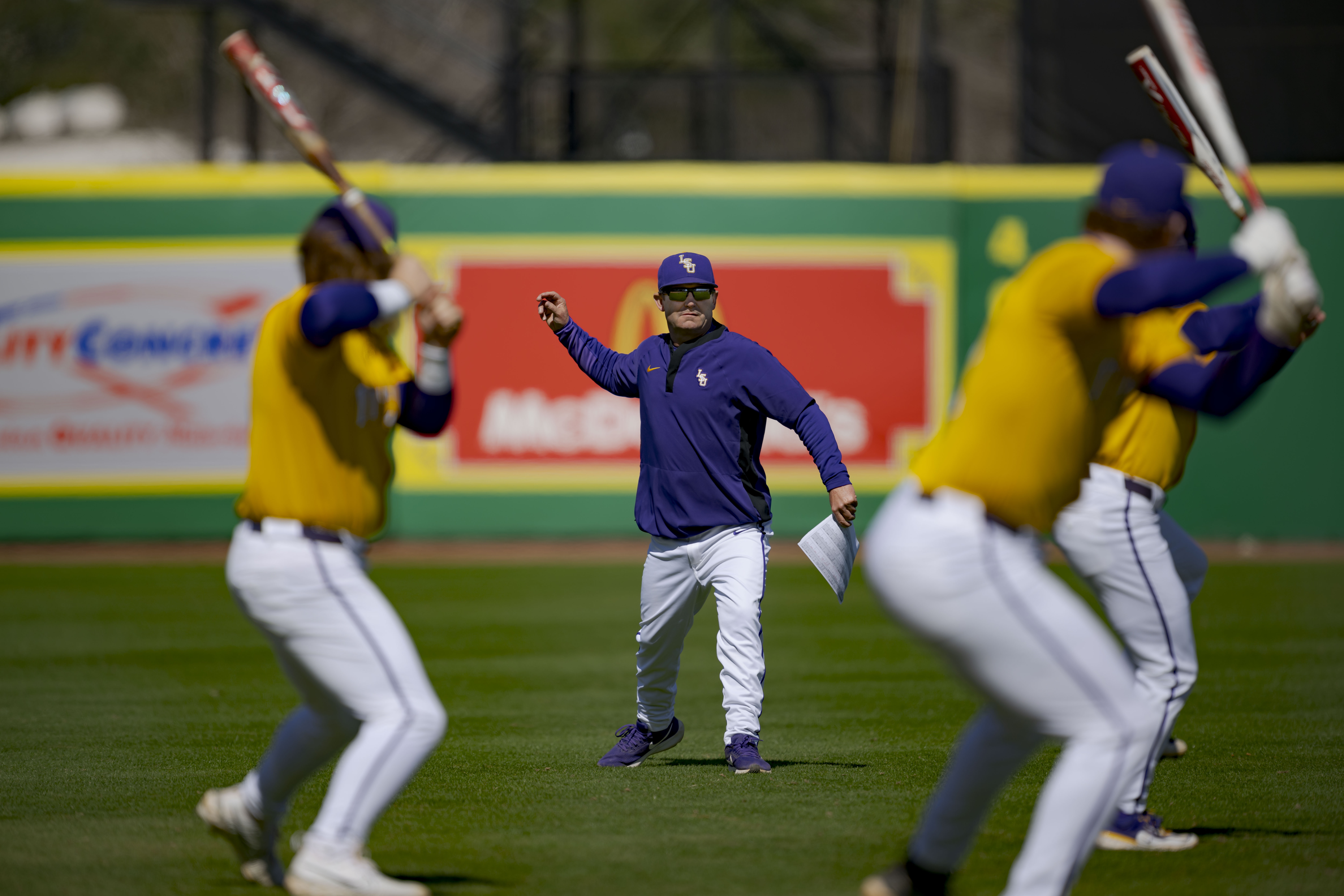 PHOTO: LSU head coach Jay Johnson runs a batting drill with his team before an NCAA baseball game against VMI on Sunday, Feb. 18, 2024, in Baton Rouge, La. (AP Photo/Matthew Hinton)