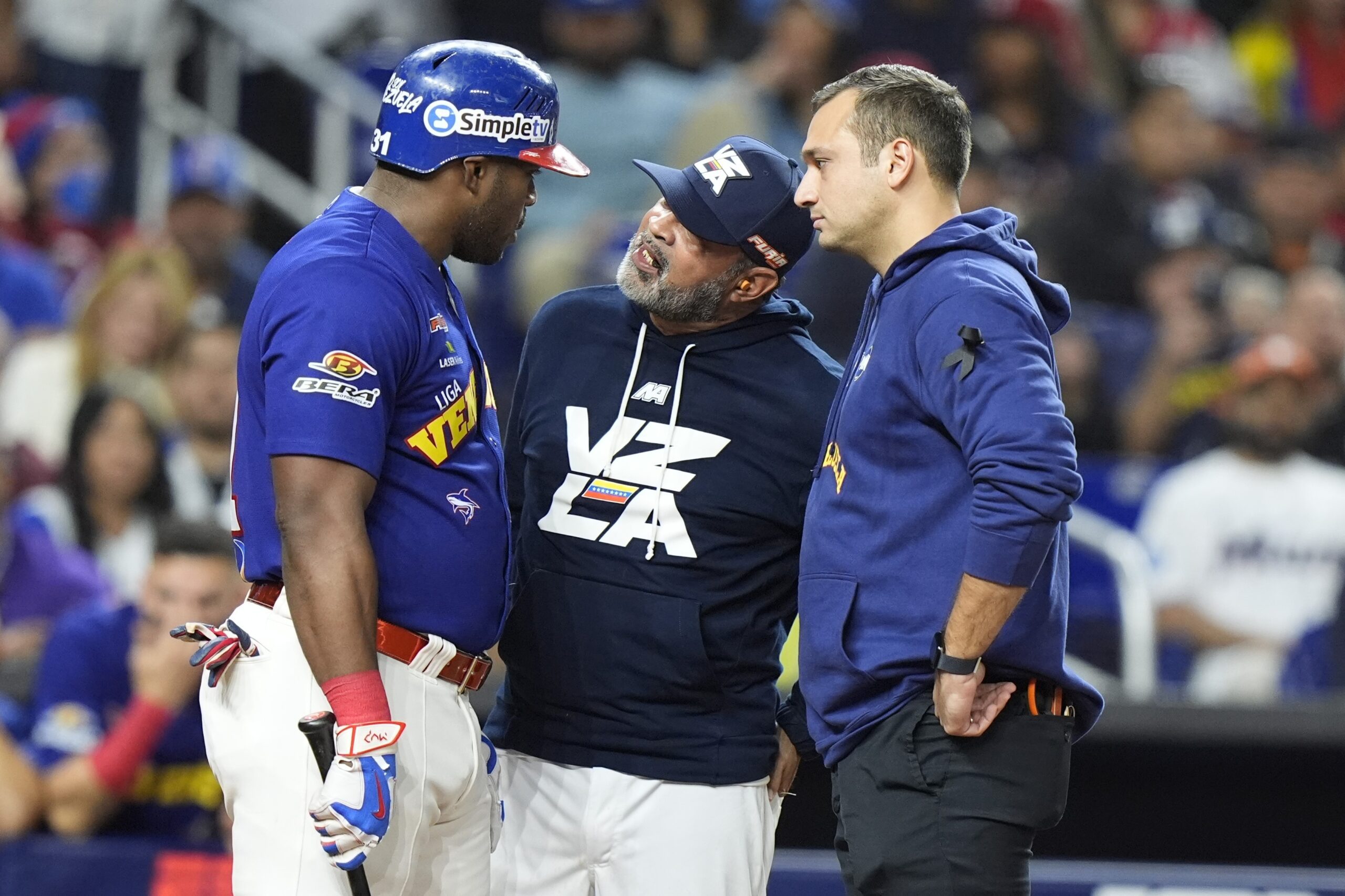 Photo: Venezuela’s manager Ozzie Guillen, center, speaks with Venezuela’s Yasiel Puig, left, during the fourth inning of the Caribbean Series finals baseball game against the Dominican Republic, in Miami, Fla., Friday, Feb. 9, 2024. Puig is returning to the LVBP with the Navegantes de Magallanes, while Guillen is returning as well, this time managing the Tigres de Aragua. (AP Photo/Wilfredo Lee)