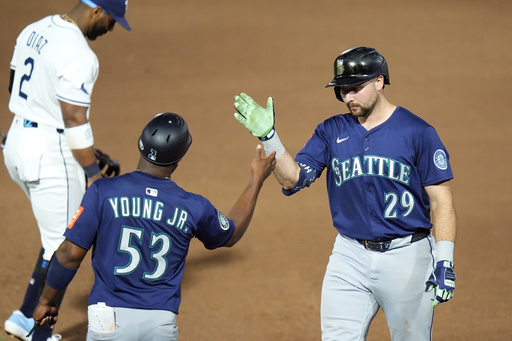TAMPA, Fla. (AP) — Cal Raleigh Tuesday night, extending his major league record for home runs by a catcher and drawing closer to Mickey Mantle for the most by a switch-hitter.