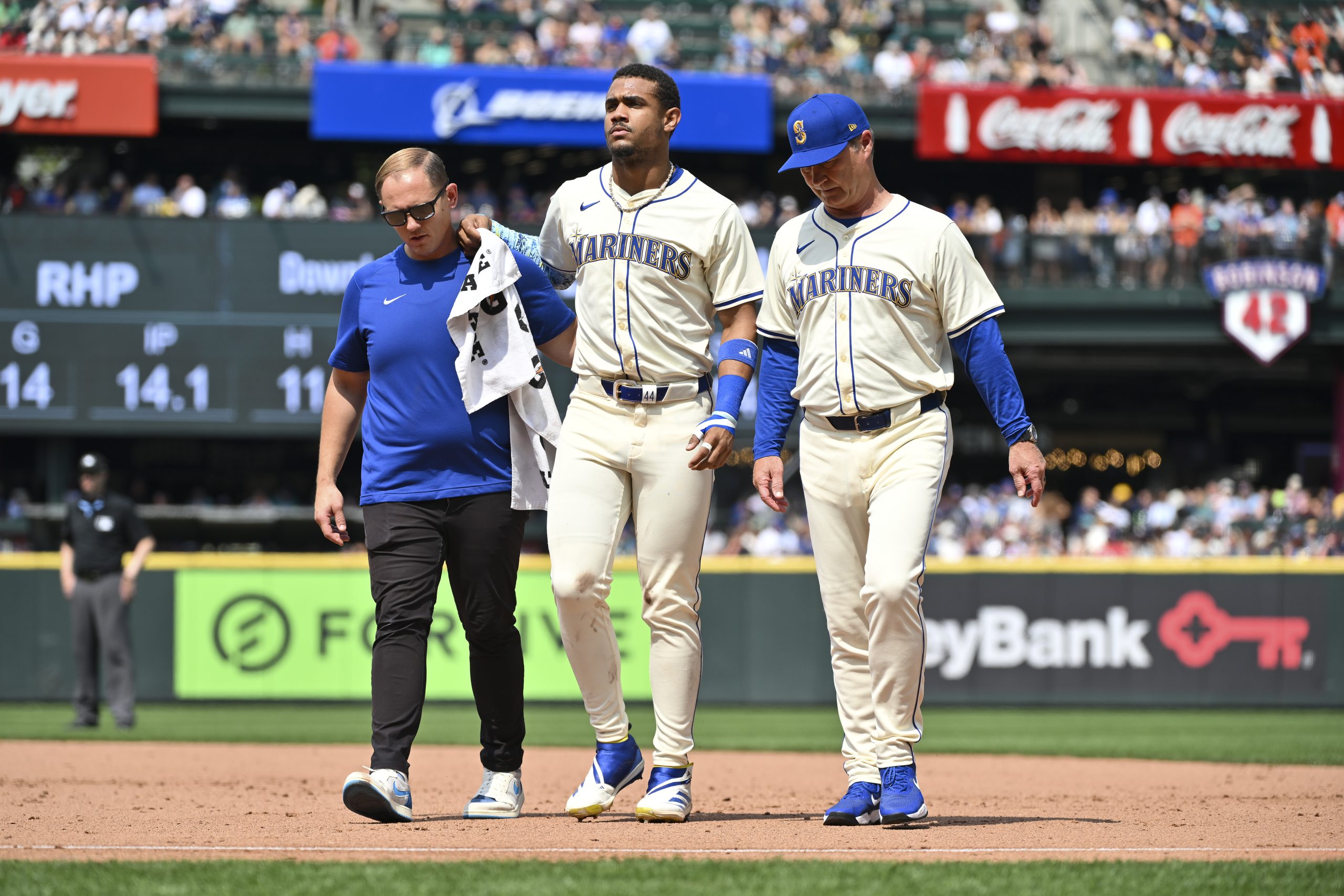 Photo Credit: Julio Rodriguez #44 of the Seattle Mariners is helped off the field by manager Scott Servais and the athletic training staff during the sixth inning against the Houston Astros at T-Mobile Park on July 21, 2024 in Seattle, Washington. (Photo by Alika Jenner/Getty Images)