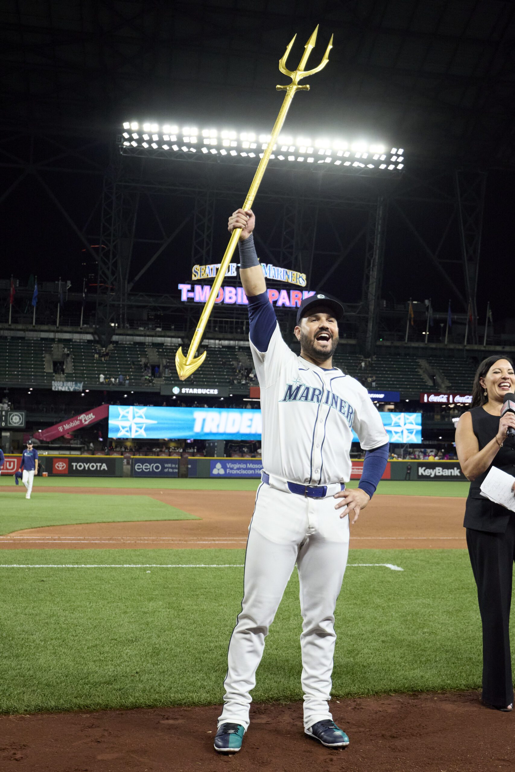Photo: Seattle Mariners’ Eugenio Suárez celebrates with the trident after a baseball game against the Chicago White Sox, Tuesday, Aug. 5, 2025, in Seattle. (AP Photo/John Froschauer)