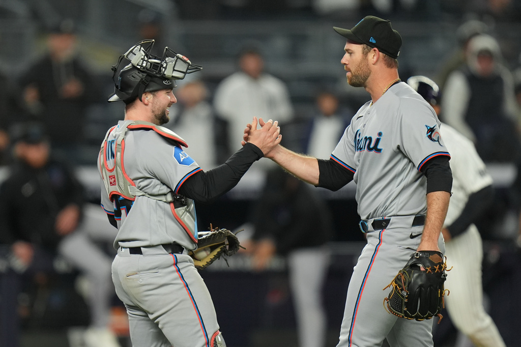 Miami Marlins pitcher Anthony Bender, right, and catcher Liam Hicks celebrate after a baseball game against the New York Yankees, Sunday, April 5, 2026, in New York. (AP Photo/Seth Wenig)