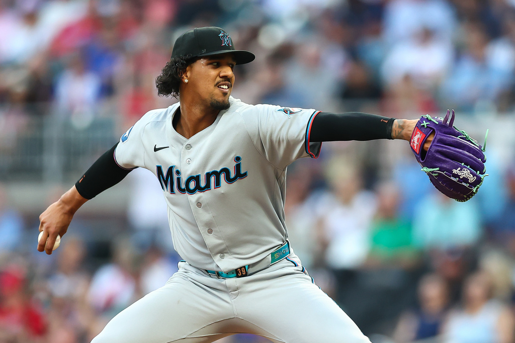 Eury Pérez did not dominate Monday. He gave Miami four innings, seven hits, four runs (three earned), two walks, two strikeouts. His fastball touched 99 mph. He struck out Ronald Acuña Jr. swinging in the first. He also loaded the bases, gave up three runs in the bottom of the fourth, and watched his pitch count climb into the 70s before he could escape the inning.