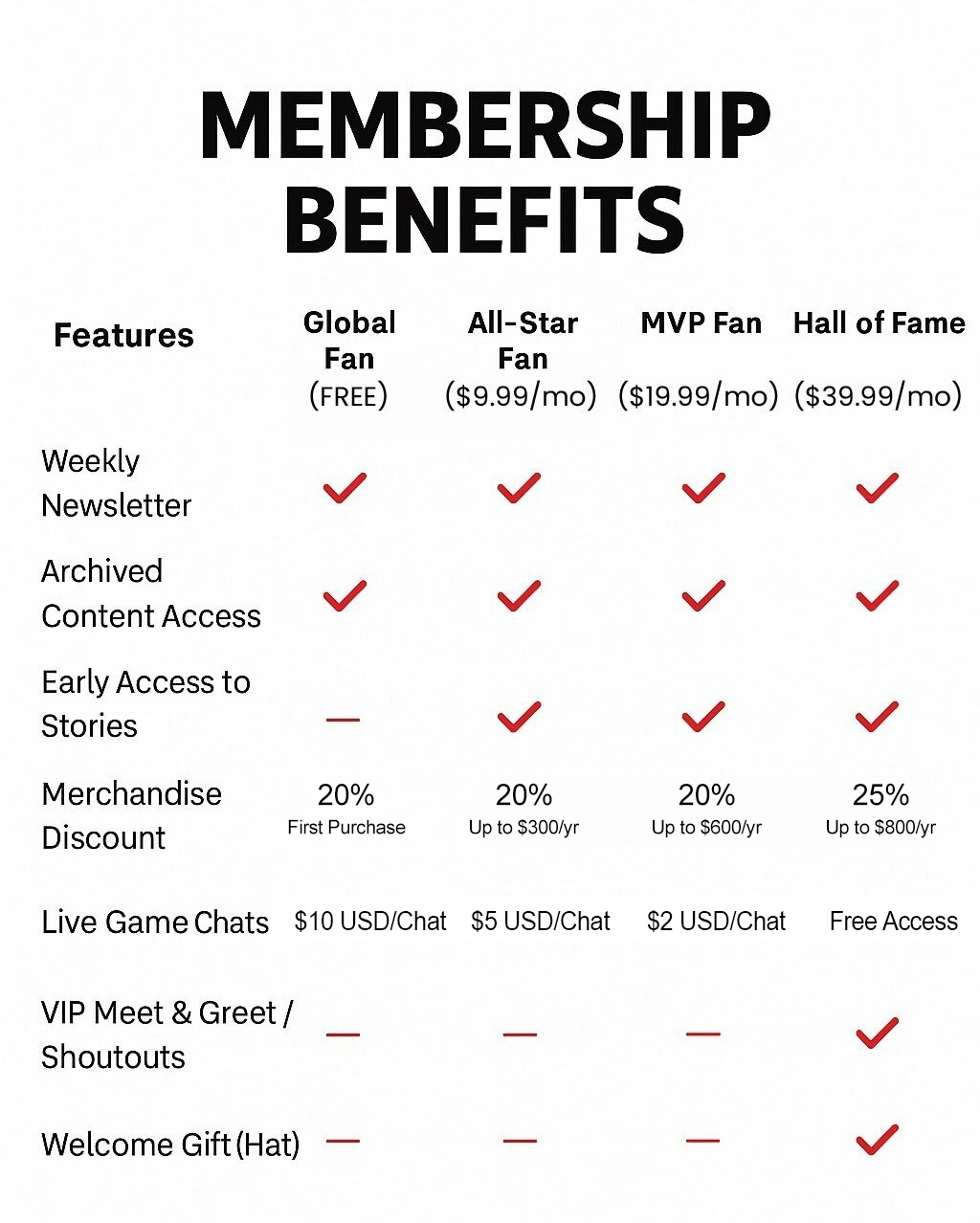 Enjoying free access to our weekly newsletter and archives, an All-Star Fan unlocking early access, giveaways, and live game chats, or an MVP Fan diving deeper with behind-the-scenes content, signed memorabilia, and special event invitations — there’s a level for every fan. For the most passionate supporters, the Hall of Fame membership offers the full experience: VIP meet & greets, free event access, exclusive discounts up to 25%, and a special welcome gift to show your team pride. No matter your tier, you’ll be part of a global network celebrating the game we all love.