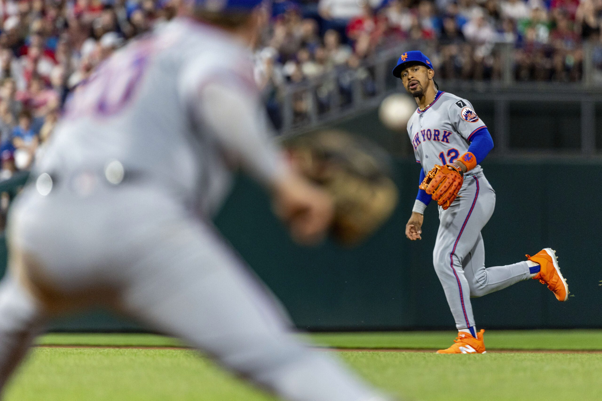 Photo: New York Mets shortstop Francisco Lindor throws to first baseman Pete Alonso (20) for the out on Philadelphia Phillies’ Nick Castellanos in the fifth inning of a baseball game, Friday, June 20, 2025, in Philadelphia. (AP Photo/Laurence Kesterson)