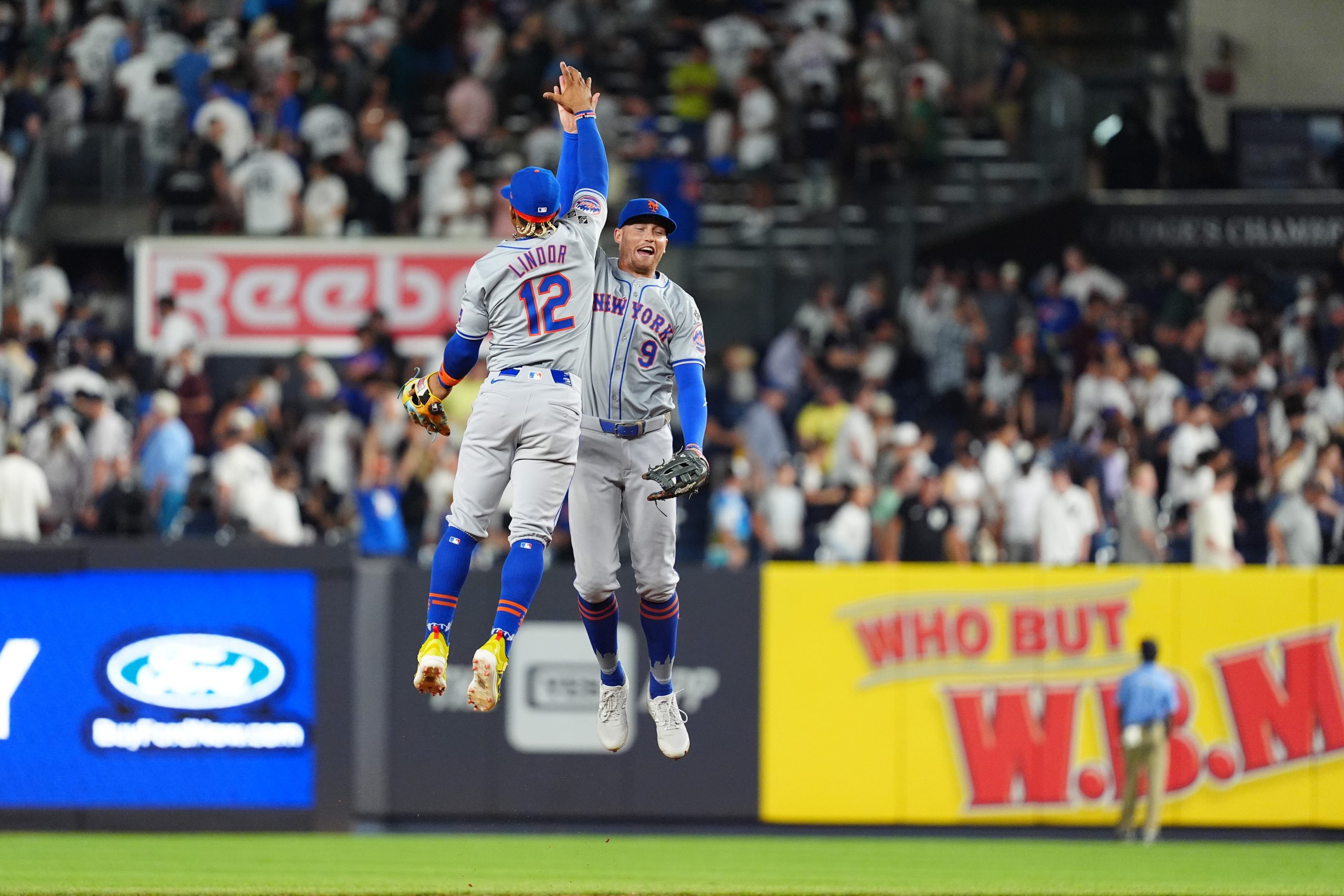 Photo Credit: New York Mets Shortstop Francisco Lindor (12) and New York Mets Left Fielder Brandon Nimmo (9) leap and hi five to celebrate the victory after the ninth inning of the MLB game between the New York Mets and New York Yankees on July 23, 2024, at Yankee Stadium in the Bronx, NY. (Photo by Gregory Fisher/Icon Sportswire via Getty Images)