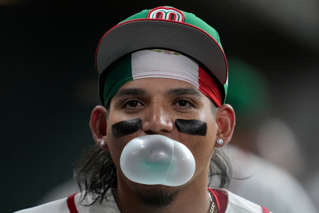 Photo: Mexico outfielder Alejandro Osuna blows a bubble in the dugout before a World Baseball Classic game against Brazil, Sunday, March 8, 2026, in Houston. (AP Photo/Ashley Landis)