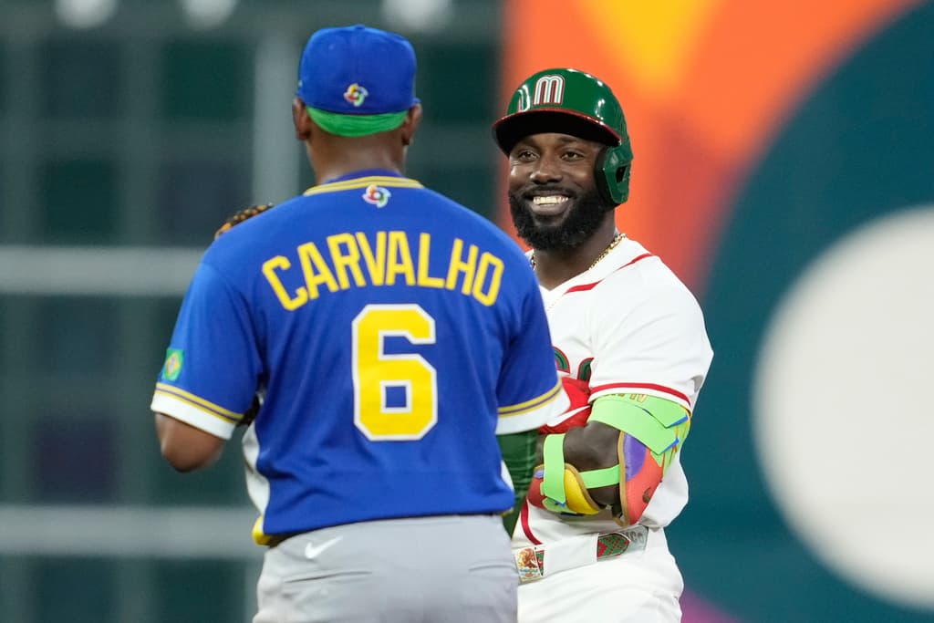 Photo: Mexico’s Randy Arozarena, right, smiles at Brazil first baseman Osvaldo Carvalho (6) after a double during the first inning of a World Baseball Classic game, Sunday, March 8, 2026, in Houston. (AP Photo/Ashley Landis)
