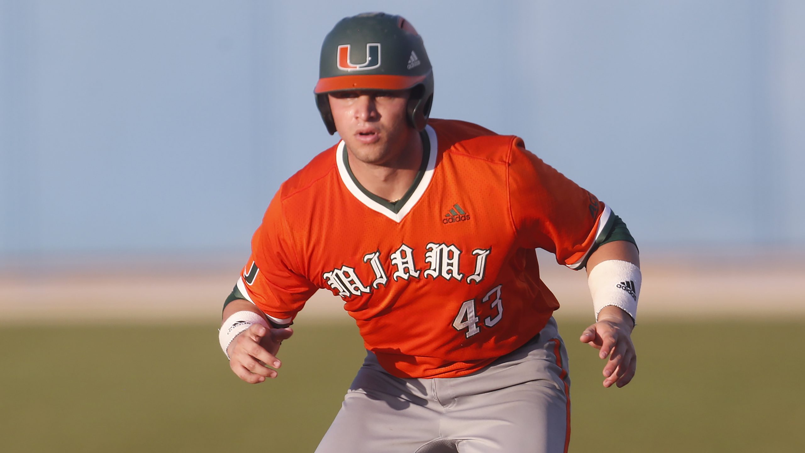 PHOTO: Miami Hurricanes outfielder Gabe Rivera (43) looks to steal third base against the FGCU Eagles during an NCAA baseball game on Wednesday, March 17, 2021 in Fort Meyers, Fla. (AP Photo/Octavio Jones)