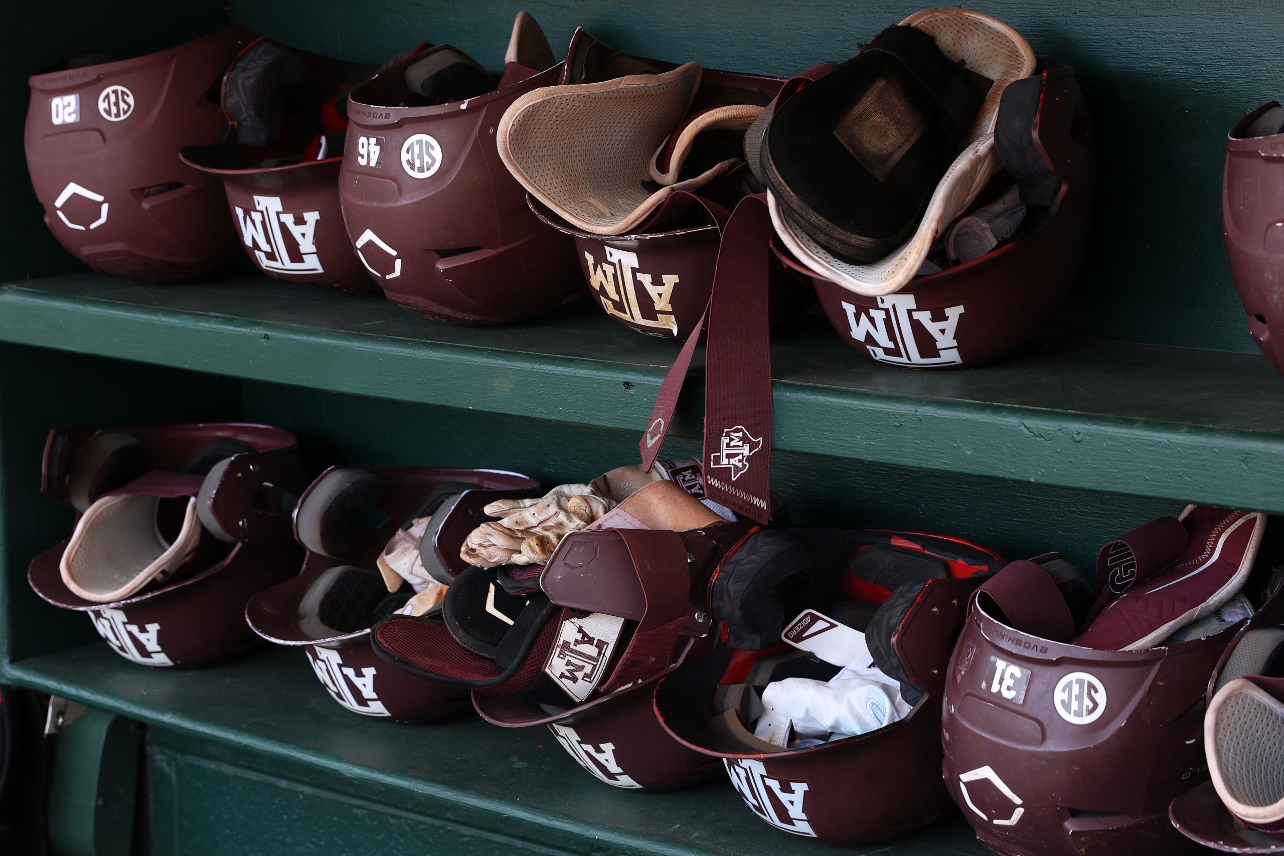 Photo Credit: A general view of Texas A&M Aggies batting helmets. (Photo by Michael Wade/Icon Sportswire via Getty Images)