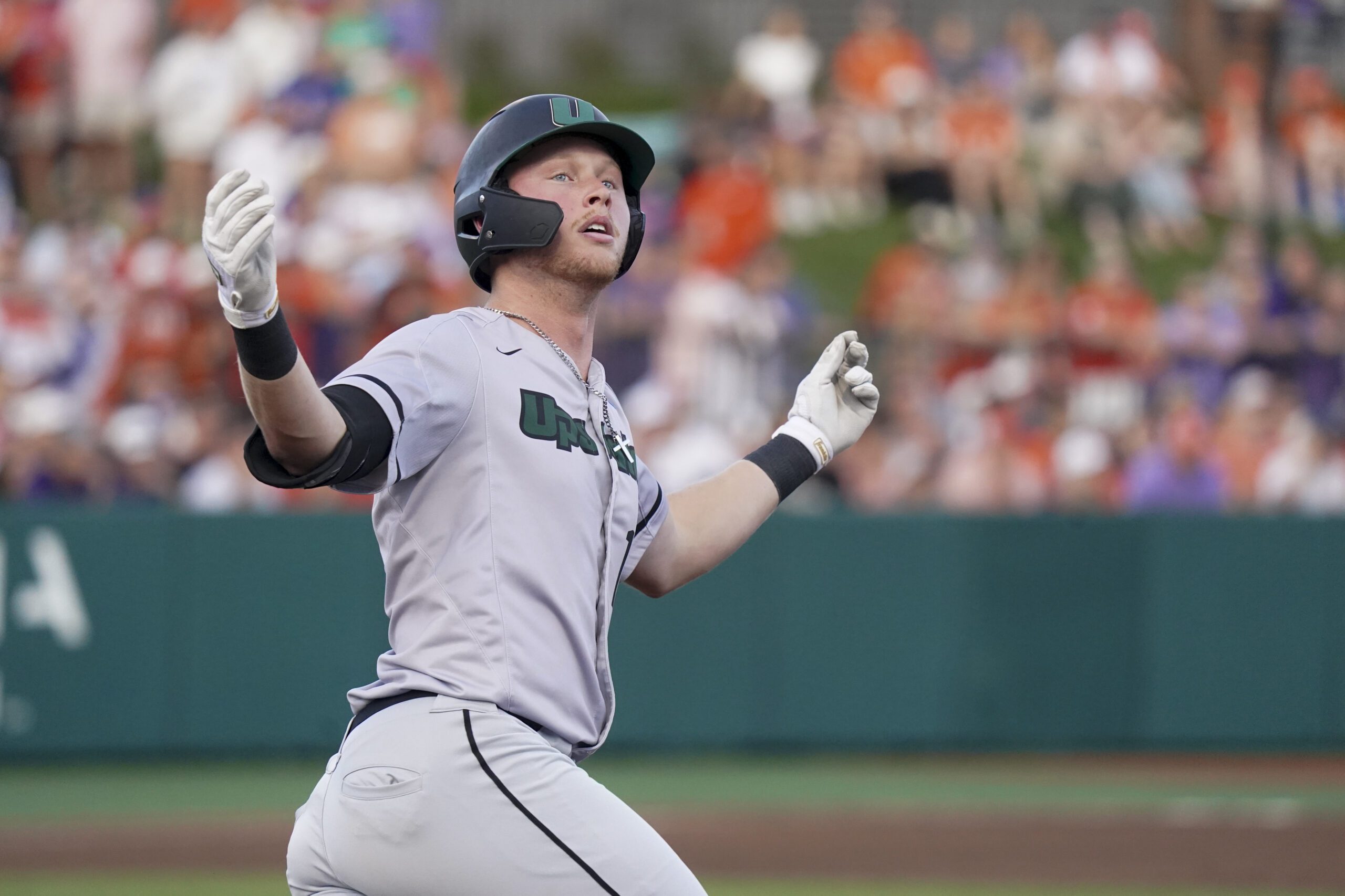 PHOTO: USC Upstate infielder Johnny Sweeney reacts after hitting a home run during an NCAA regional baseball game against Clemson on Friday, May 30, 2025, in Clemson, S.C. Clemson won 7-3. (AP Photo/Sean Rayford)
