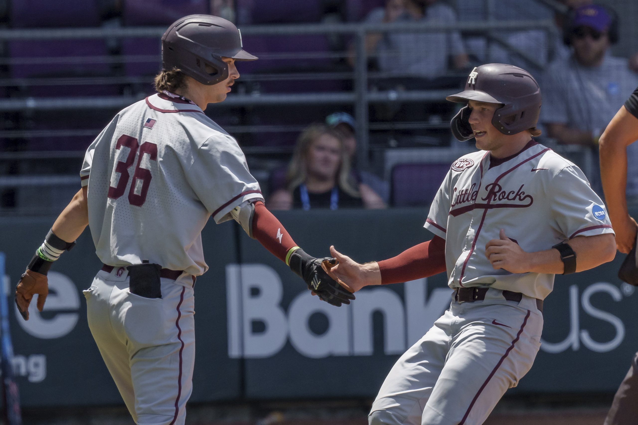 Photo: Cooper Chaplain, right, celebrates a run with Little Rock infielder Sammy Harris (36) during an NCAA regional baseball game against Rhode Island on Saturday, May 31, 2025, in Baton Rouge, La. (AP Photo/Matthew Hinton)