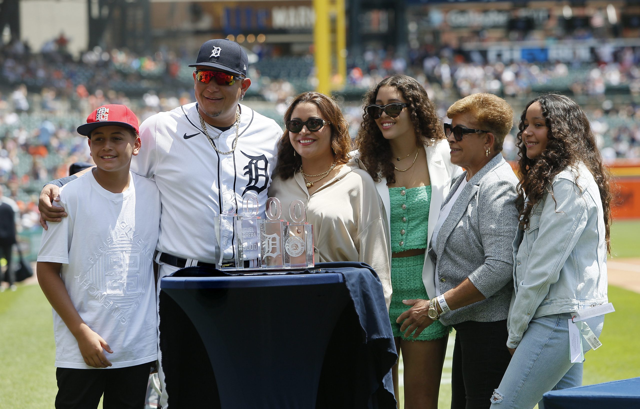Photo Credit: Miguel Cabrera #24 of the Detroit Tigers with his son Christopher, wife Rosangel, daughter Brisel, mother Gloria and daughter Isabella (R) pose with his 3,000 hit trophy during a ceremony before a game against the Toronto Blue Jays at Comerica Park on June 12, 2022, in Detroit, Michigan. (Photo by Duane Burleson/Getty Images)