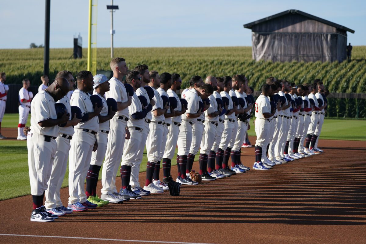 Photo: Chicago Cubs players stand for the national anthem before a baseball game against the Cincinnati Reds at the Field of Dreams movie site, Thursday, Aug. 11, 2022, in Dyersville, Iowa. (AP Photo/Charlie Neibergall)