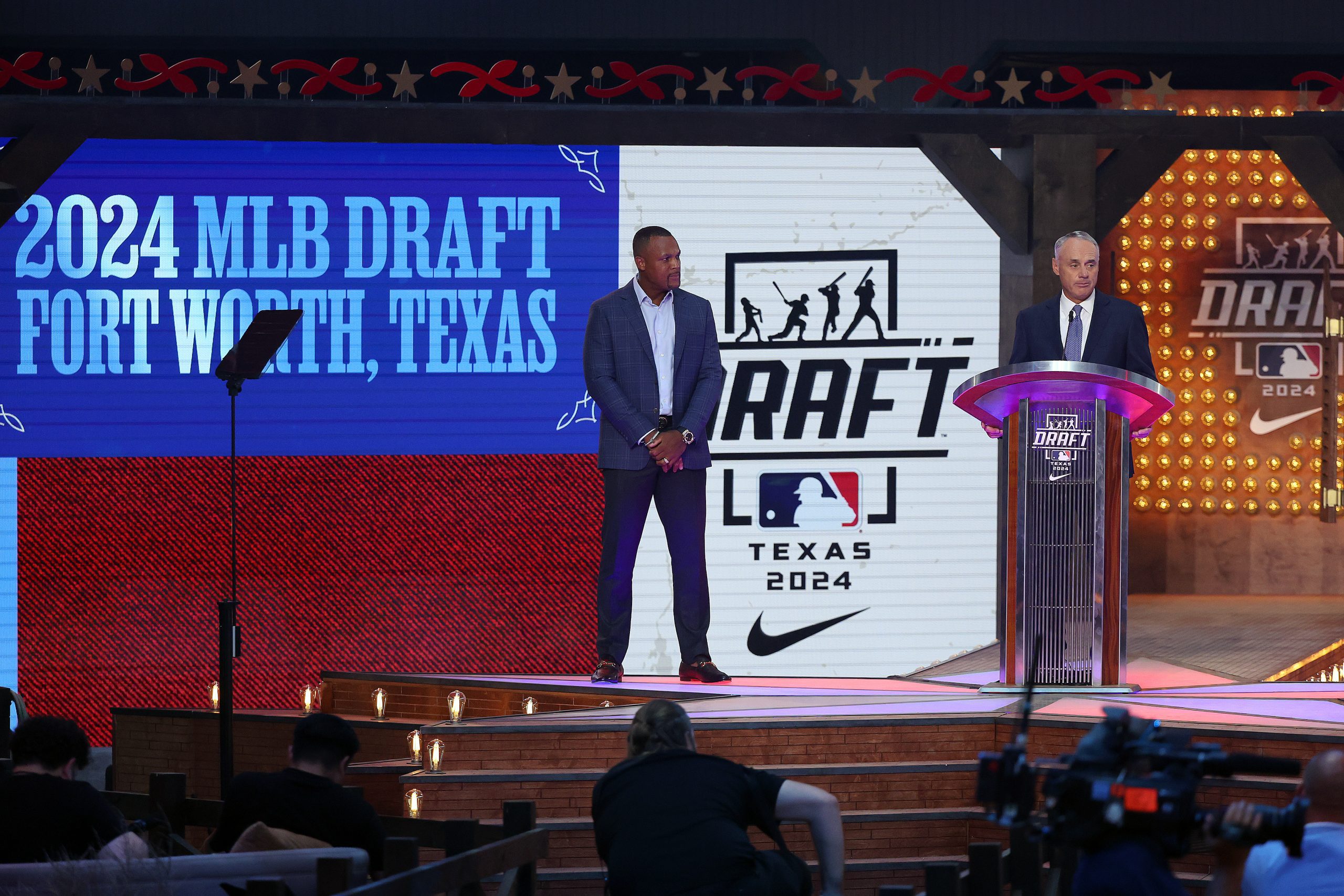 Photo Credit: 2024 Baseball Hall of Fame Inductee Adrian Beltre and Major League Baseball commissioner Robert D. Manfred Jr. take the stage at the start of the 2024 MLB Draft at Cowtown Coliseum on July 14, 2024 in Fort Worth, Texas. (Photo by Richard Rodriguez/Getty Images)
