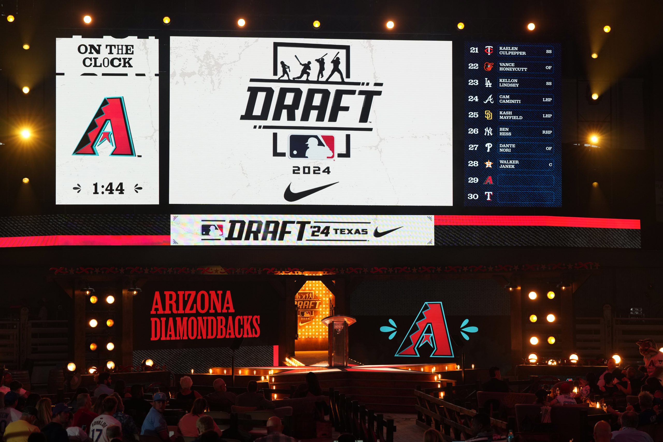 Photo Credit: A general view of the stage during the Arizona Diamondbacks selection in the first round during the 2024 MLB Draft presented by Nike at Cowtown Coliseum on Sunday, July 14, 2024 in Fort Worth, Texas. (Photo by Sam Hodde/MLB Photos via Getty Images)
