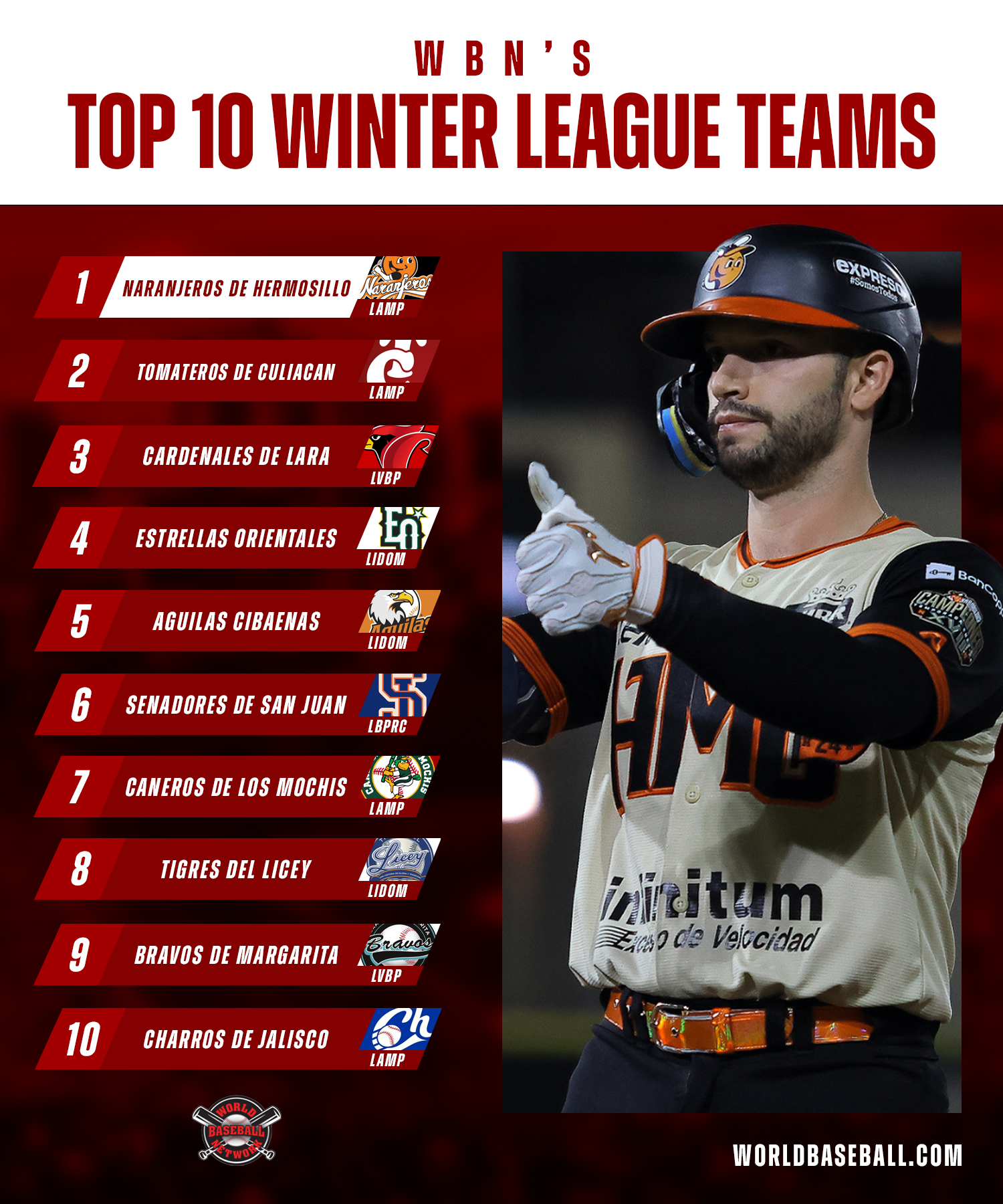 The Bravos de Margarita of the LVBP are ninth, with a 31-25 record this season, earning 10 points in the poll, five more than the 10th-ranked Charros de Jalisco.