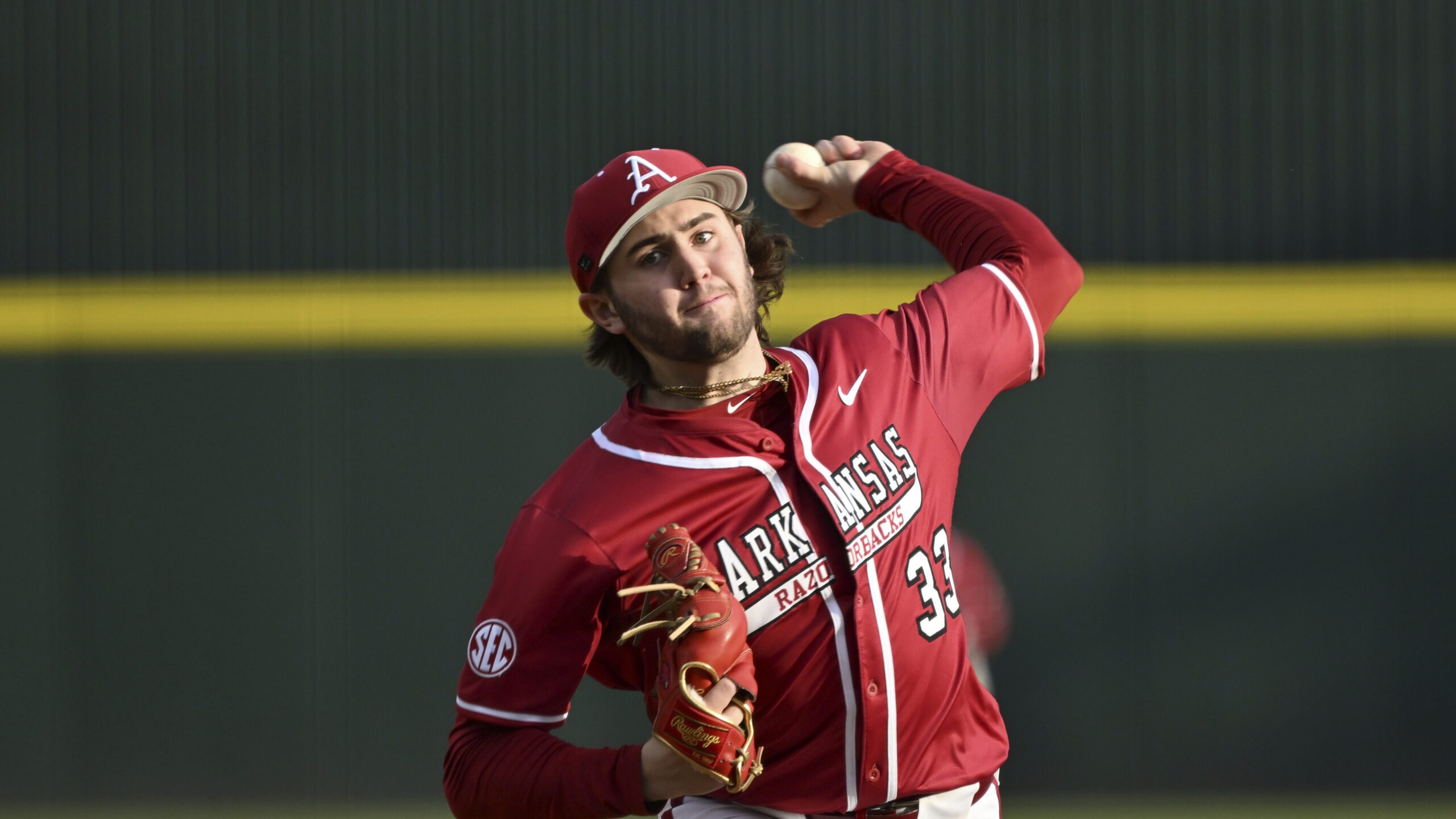 Photo: Arkansas pitcher Zach Root (33) throws a pitch against Washington State during an NCAA baseball game on Friday, Feb. 14, 2025, in Fayetteville, Ark. (AP Photo/Michael Woods)