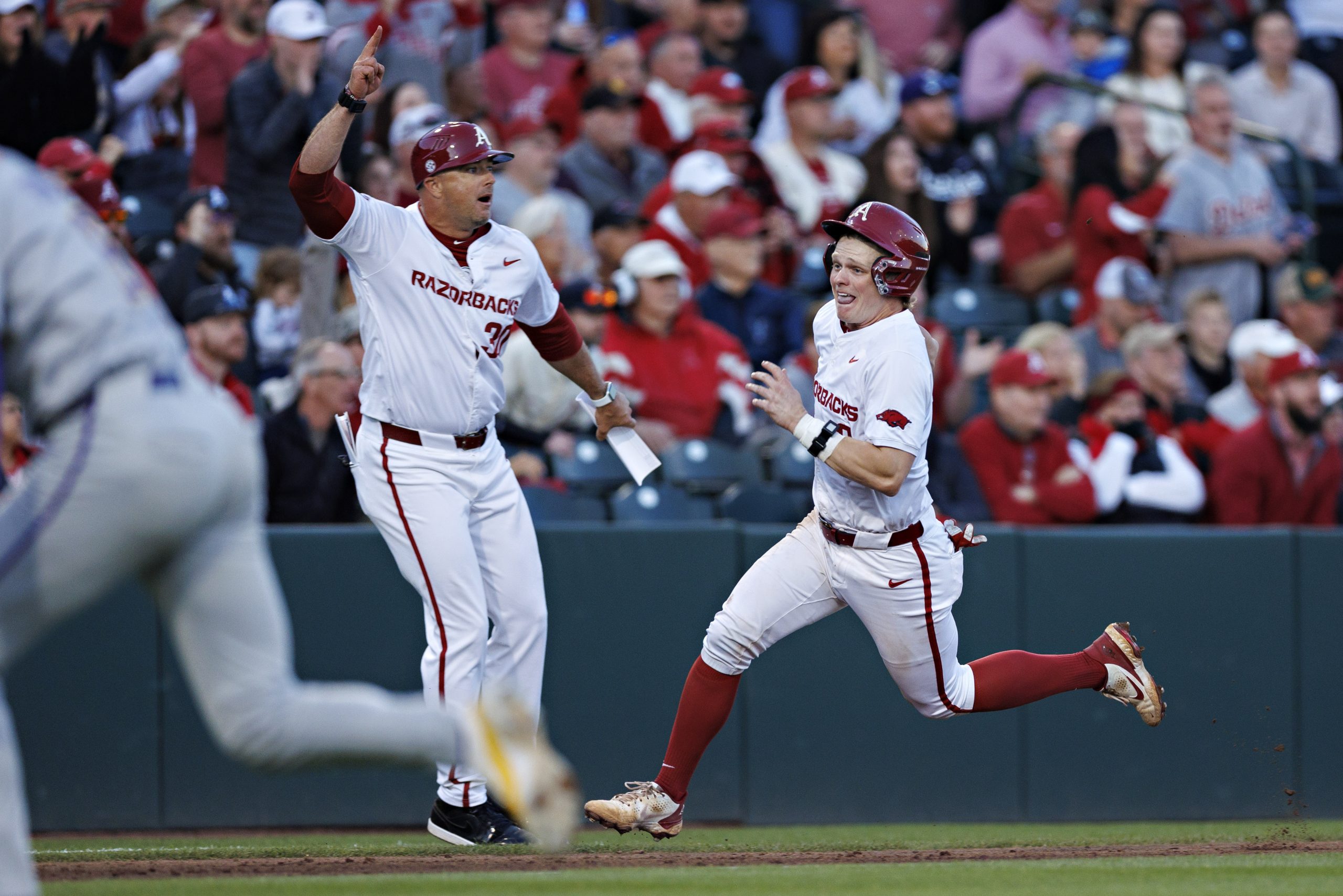 Hudson White, #8 of the Arkansas Razorbacks, rounds third base during the game against the LSU Tigers at Baum-Walker Stadium at George Cole Field on March 28, 2024, in Fayetteville, Arkansas. The Razorbacks defeated the Tigers 7-4. (Photo by Wesley Hitt/Getty Images)
