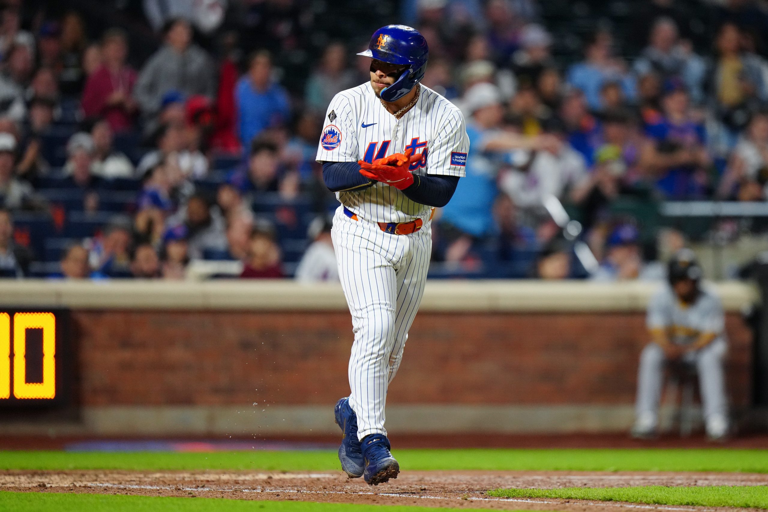 Francisco Alvarez #4 of the New York Mets reacts after walking. (Photo by Daniel Shirey/MLB Photos via Getty Images)