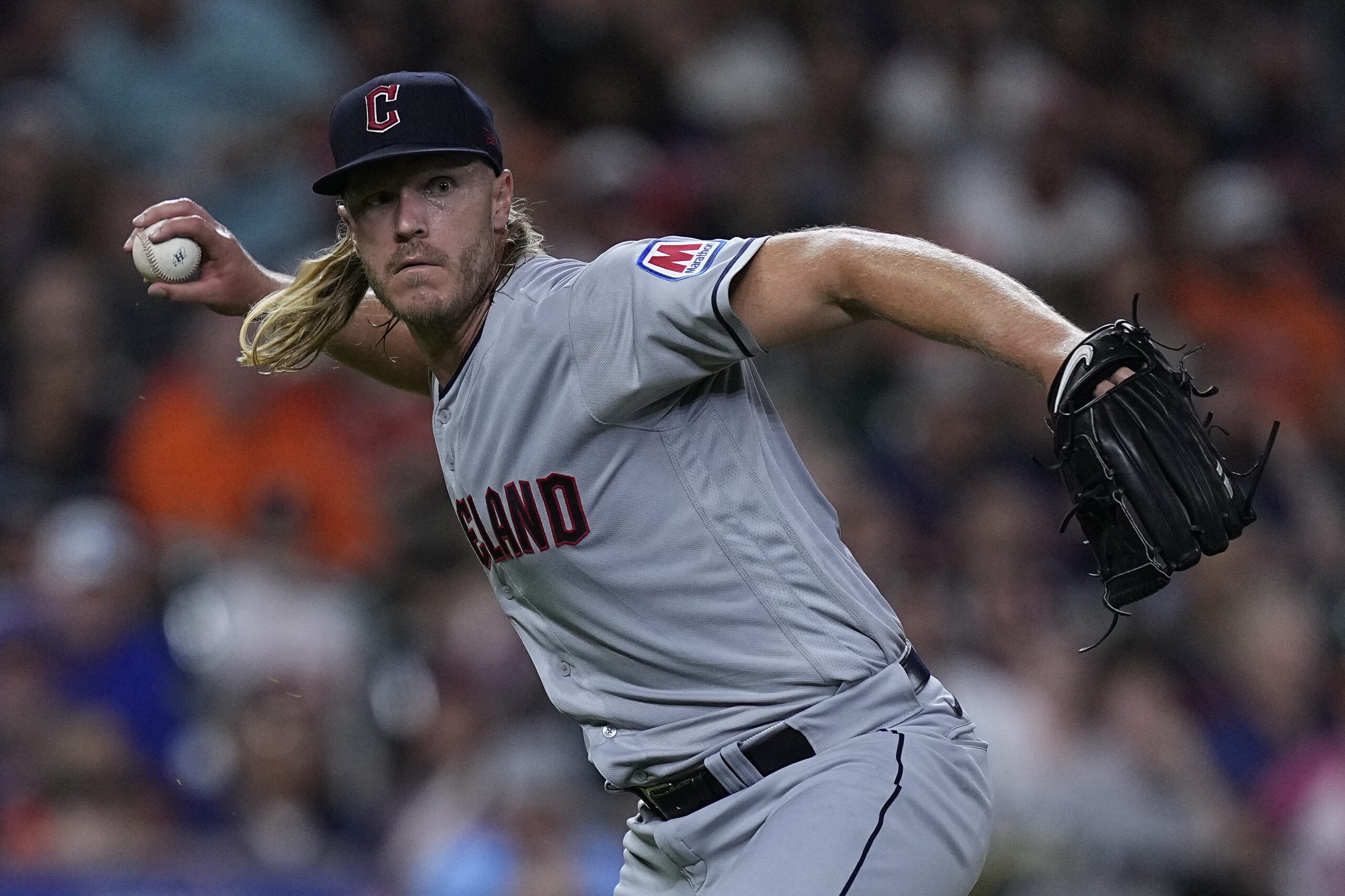 Photo: Cleveland Guardians starting pitcher Noah Syndergaard throws out Houston Astros’ Jeremy Pena on a comebacker during the sixth inning of a baseball game, Monday, July 31, 2023, in Houston. (AP Photo/Kevin M. Cox)