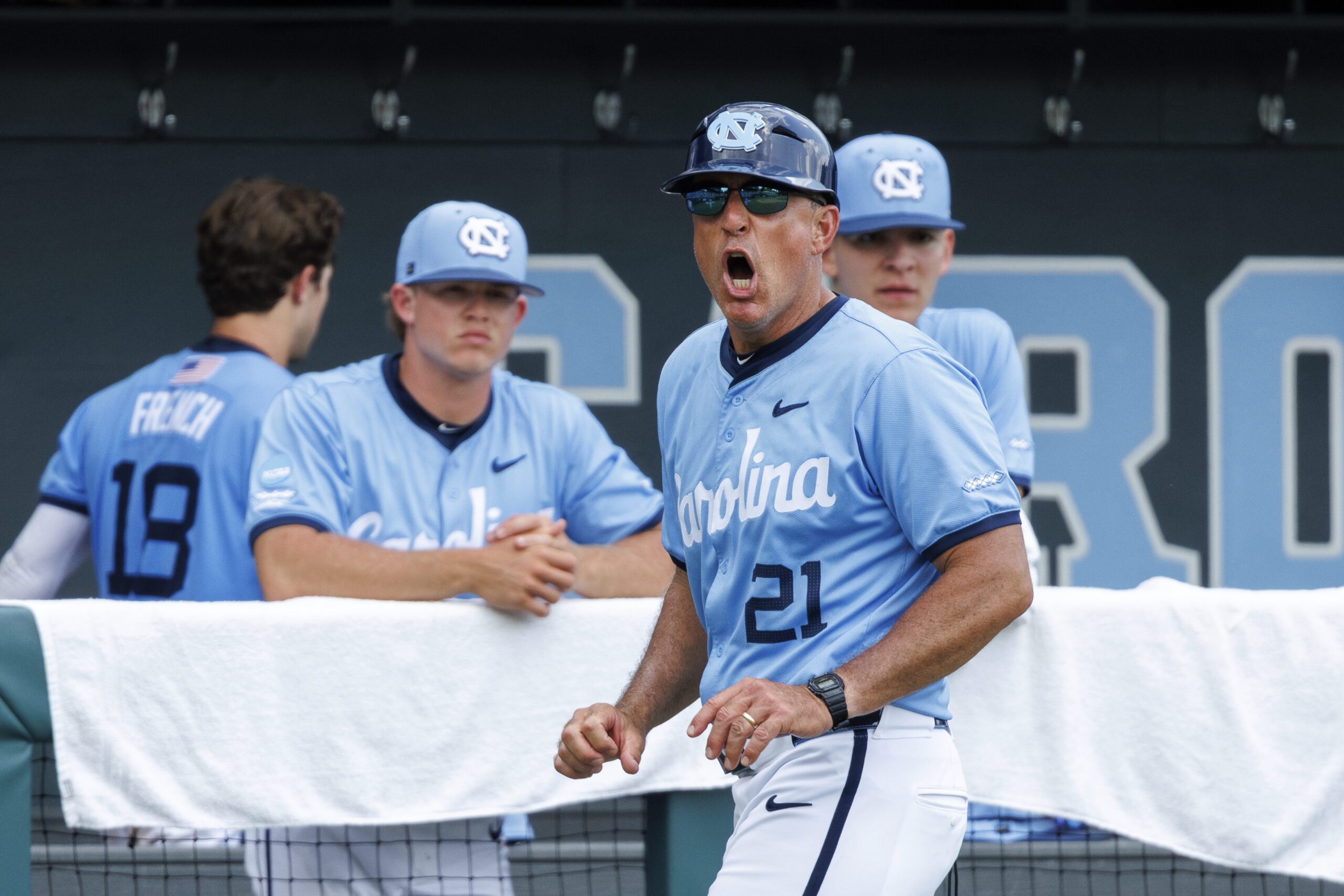 PHOTO: North Carolina head coach Scott Forbes shouts at an umpire after a called third strike in the eighth inning of an NCAA super regional baseball game against Arizona on Saturday, June 7, 2025, in Chapel Hill, N.C. (AP Photo/Ben McKeown)