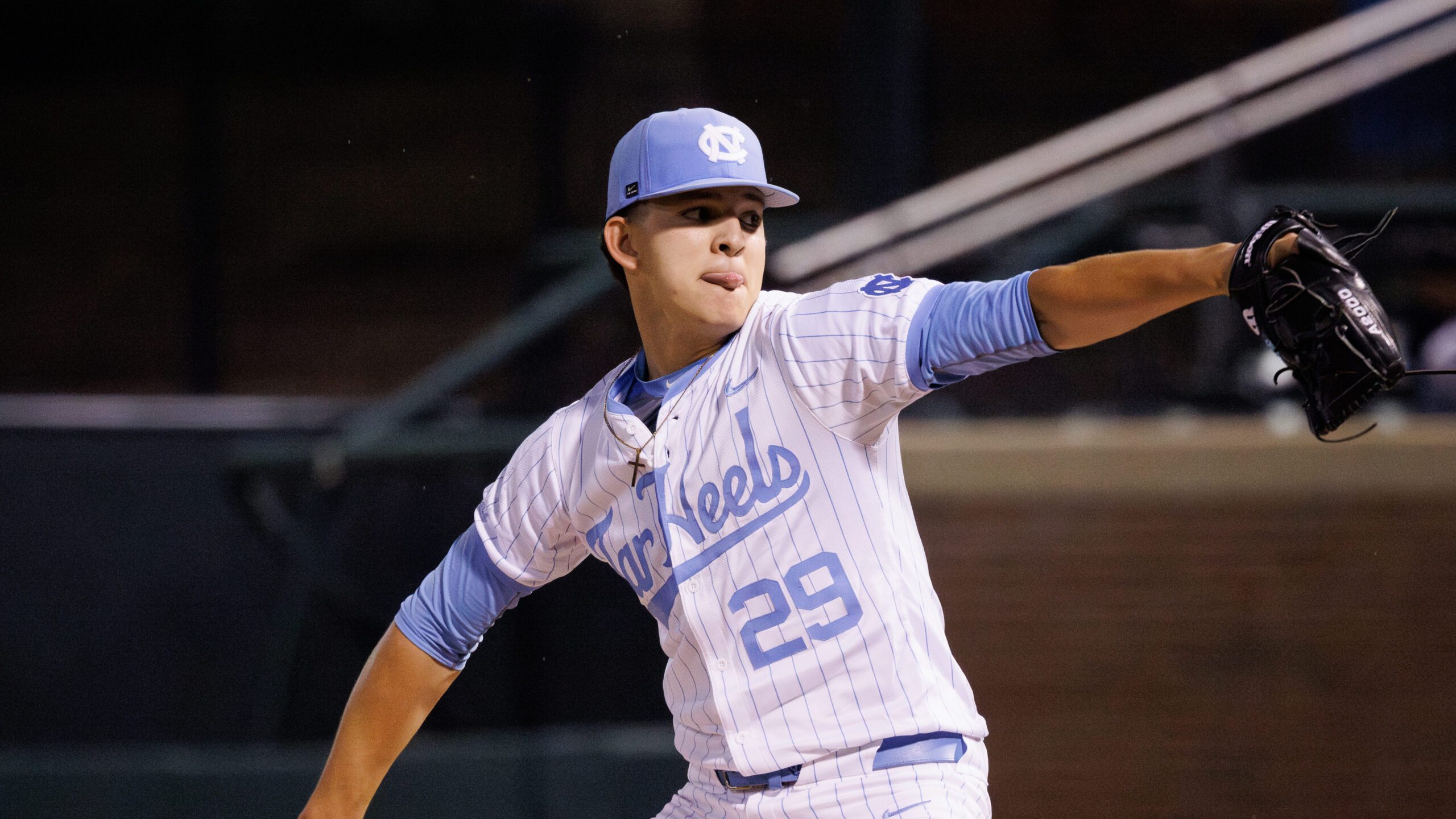 PHOTO: North Carolina Jason DeCaro (29) pitches during an NCAA baseball game on Friday, March 20, 2026, in Chapel Hill, N.C. (AP Photo/Ben McKeown)