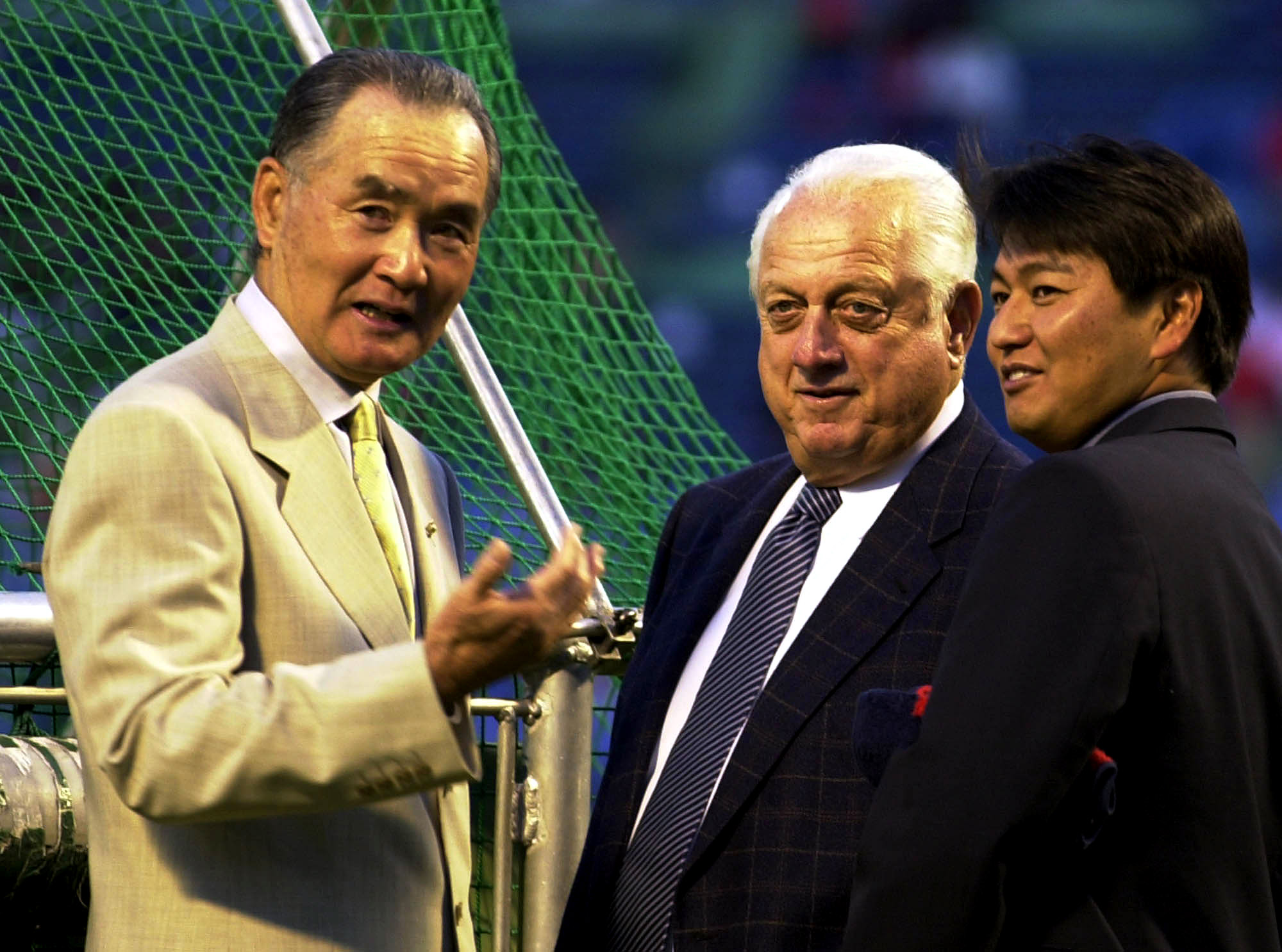 Photo: Former Los Angeles Dodgers manager Tommy Lasorda, center, chats with former Yomiuri Giants manager Shigeo Nagashima, left, prior to Game Three of the Japan Series at Jingu Stadium in Tokyo Tuesday, Oct. 23. 2001. (AP Photo/Koji Sasahara)