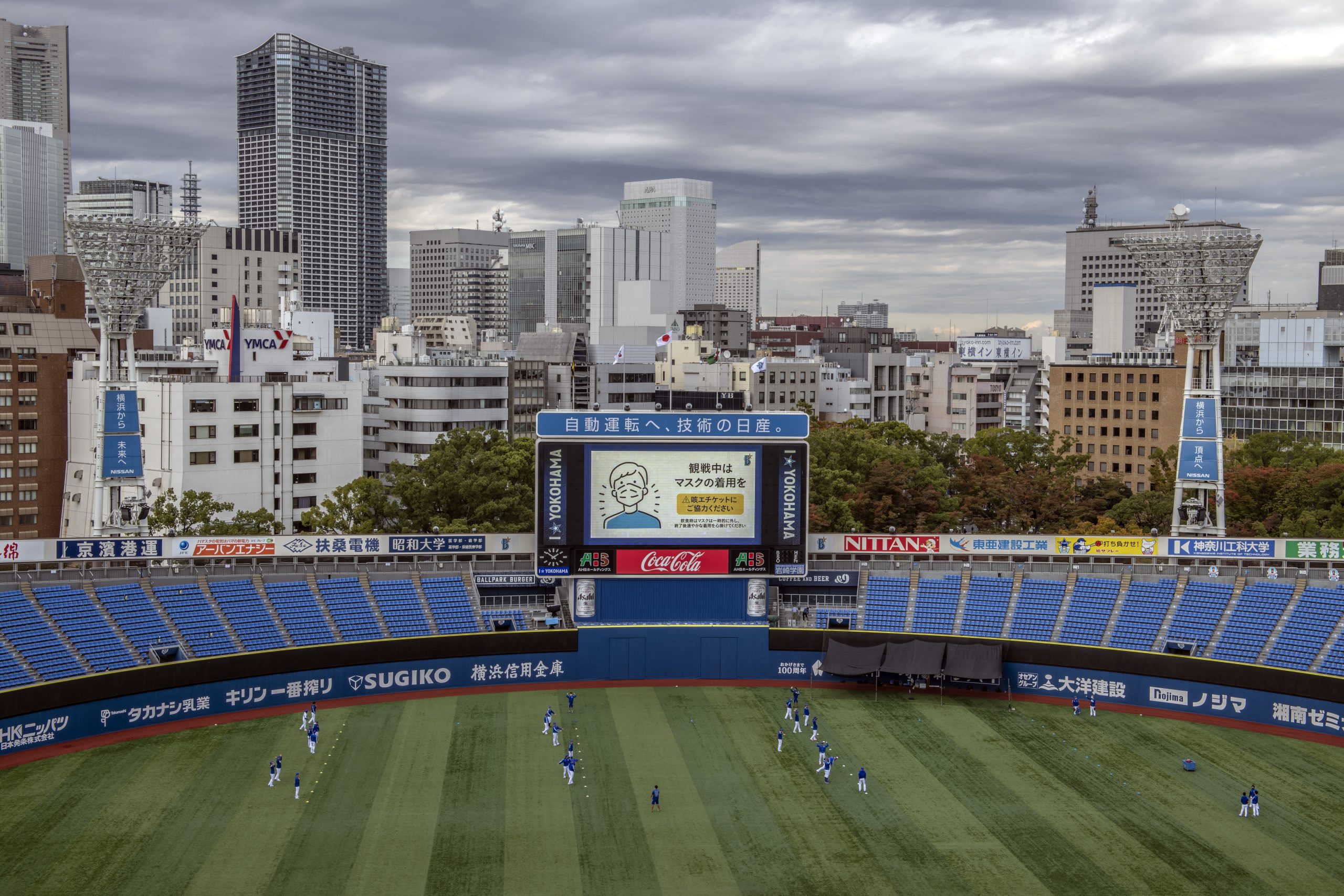 Photo Credit: A notice requesting spectators wear a face mask is displayed on a giant screen at Yokohama Stadium. (Photo by Carl Court/Getty Images)