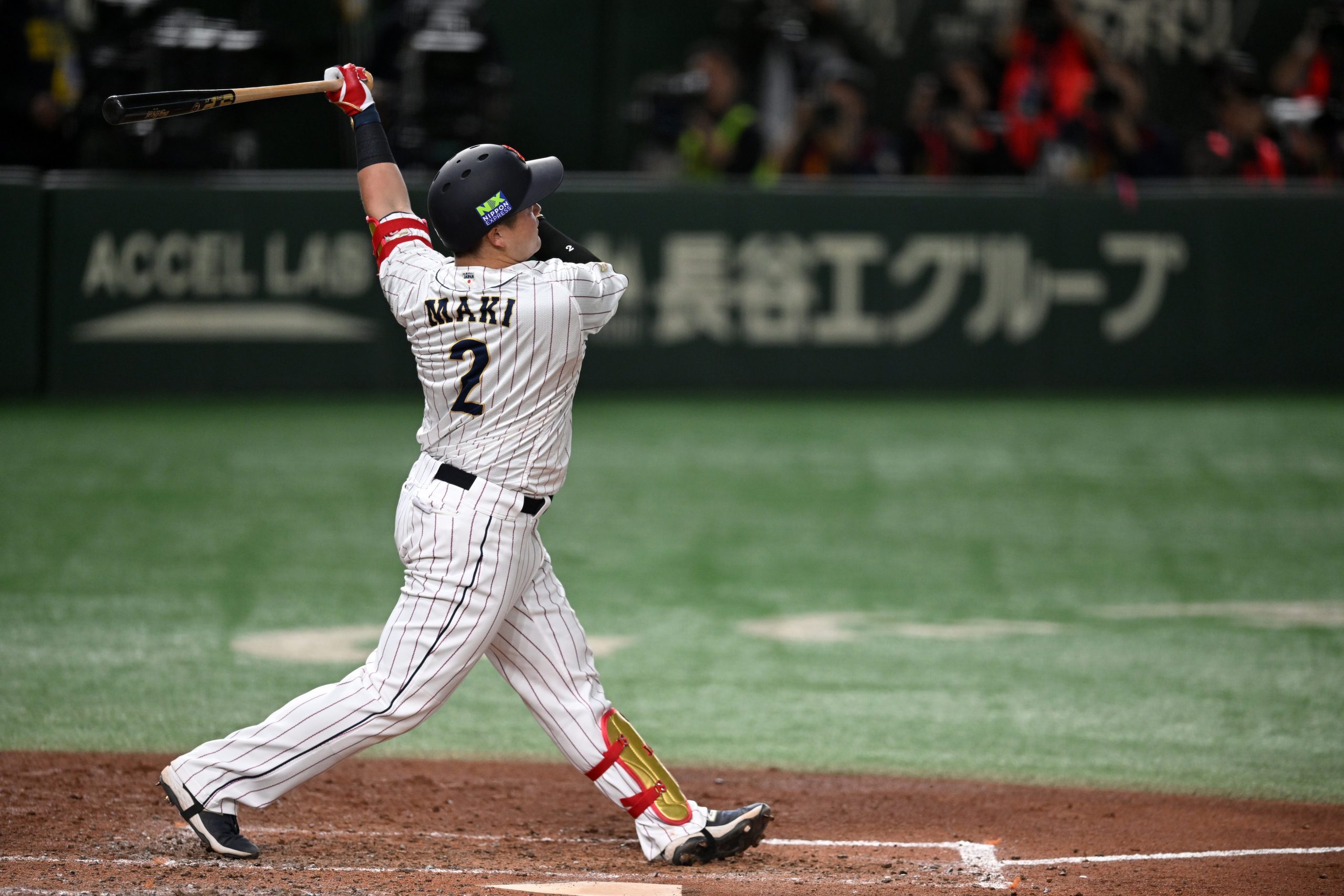 Photo Credit: Infielder Shugo Maki #2 of Japan hits a solo home run in the 5th inning during the Asia Professional Baseball Championship Final between South Korea and Japan at Tokyo Dome on November 19, 2023 in Tokyo, Japan. (Photo by Gene Wang/Getty Images)