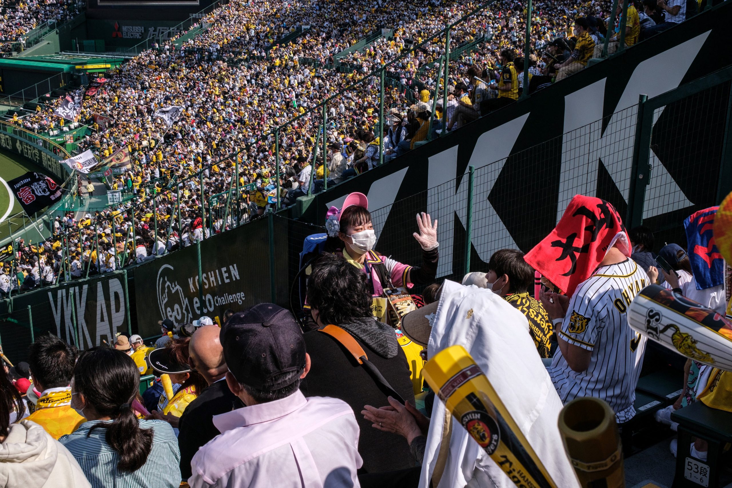 Photo Credit: This picture taken on April 10, 2022 shows people watching a Nippon Professional Baseball match between the Hanshin Tigers and Hiroshima Toyo Carp at Koshien Stadium in Nishinomiya, Hyogo prefecture, between Kobe and Osaka. (Photo by Philip FONG / AFP) / TO GO WITH baseball-JPN-health-virus-Tigers,FOCUS by Andrew MCKIRDY (Photo by PHILIP FONG/AFP via Getty Images)