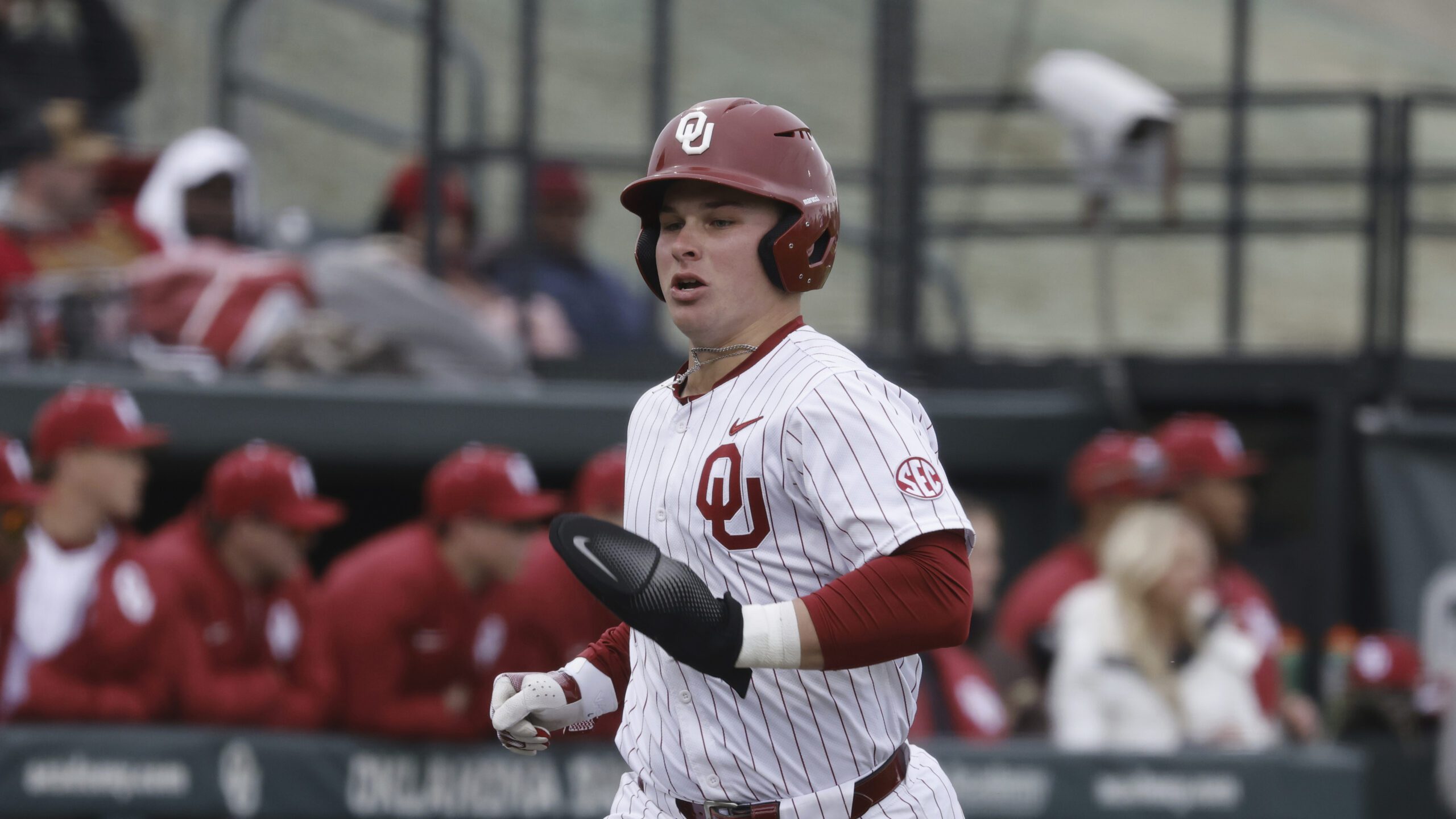 PHOTO: Oklahoma’s Jaxon Willits during an NCAA baseball game on Friday, Feb. 14, 2025, in Norman, Okla. (AP Photo/Garett Fisbeck)