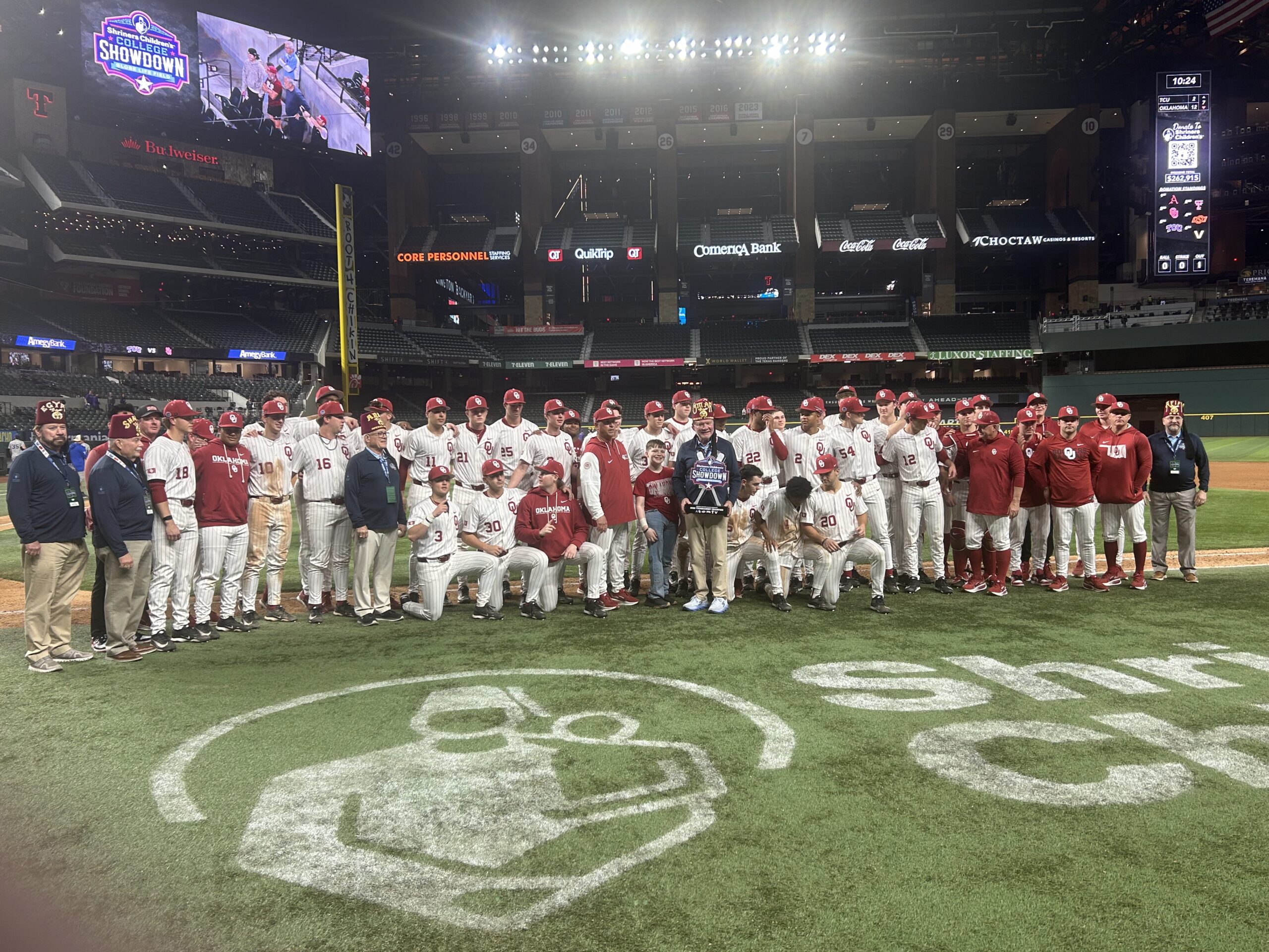ARLINGTON, Texas – After a 12-2 win over the TCU Horned Frogs on Sunday, the Oklahoma Sooners won the 2026 Shriners Children’s College Showdown at Globe Life Field.