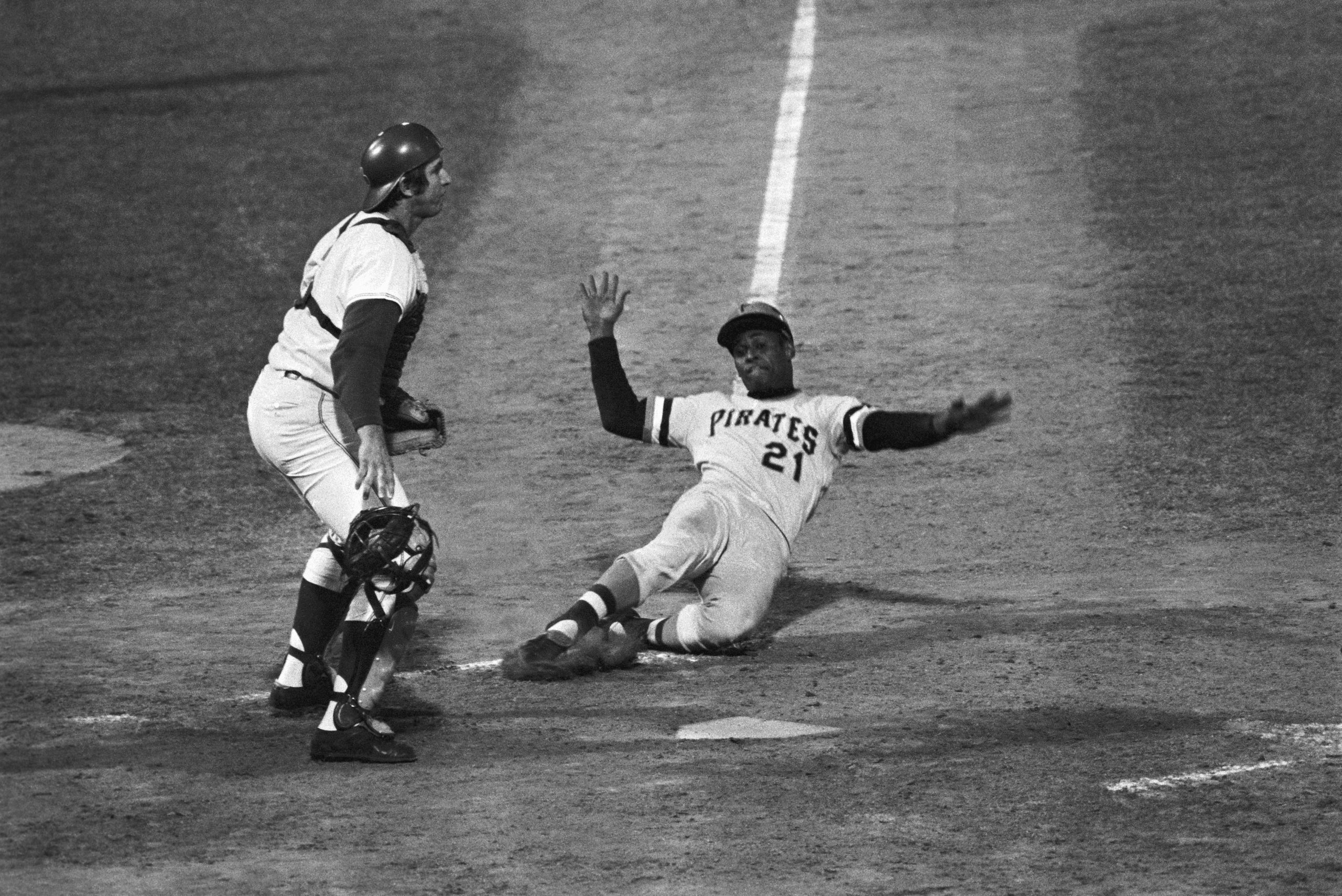 Photo Credit: Pittsburgh Pirates’ Roberto Clemente (21) slides home in the seventh inning.
